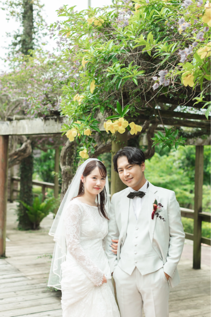 チャペル周辺の緑豊かなガーデンでの撮影も、上品でリゾート感あふれる一枚に。