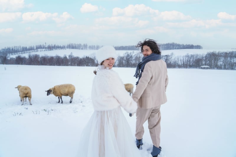冬の北海道での2泊3日カップル旅行の標準価格が15万〜20万円であることを考えると、旅行費用と合わせても50万円ほどで楽しめるシーズンも。動物たちとの触れ合いや、真っ白な雪景色の中で、特別なフォトウェディング体験に。
