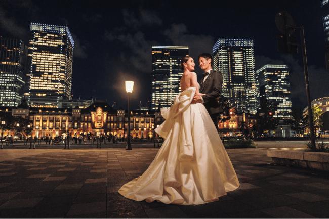 東京のフォトウェディングは、スタイリッシュな街並みや歴史的な建築物を背景に、洗練された写真を残したいカップルにぴったりです。