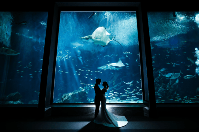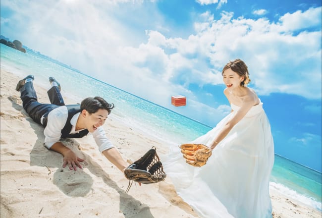 「海外に赴任するとお伝えしたところ、カメラマンの百田さんの素敵なアイデアで地図を使った素敵な写真を撮ってくださいました。海ではこちらの無茶ぶりにも快く応じてくださり、私たちらしい思い出の写真を撮ることができました!」