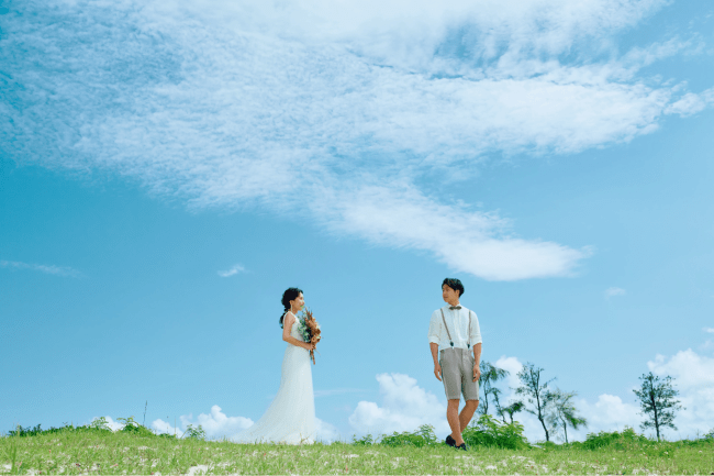 デコルテフォトグラフィーでは、なんとドローン撮影も可能! 沖縄の絶景の海や北海道の大自然など、まるで絵のような美しい撮影が叶います。ドローン撮影では、広角のダイナミックな写真が撮影できるので、ふたりの姿はもちろん、風景を広々と切り取りたい撮影にぴったりです。
