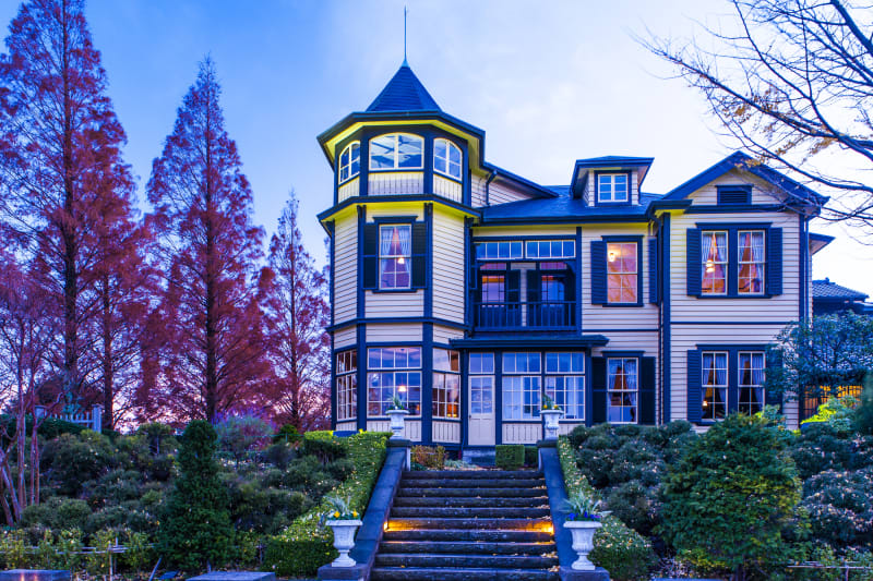 園内に佇む「外交官の家」や「ブラフ18番館」といった歴史的建造物は夜間にライトアップされます。重厚な歴史を感じさせる建築物とともにイタリア式庭園特有のシンメトリーな花壇、水路や噴水も美しく照らされる光景はロマンチック。