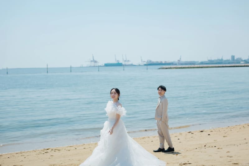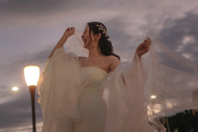 潮風に揺れる柔らかなチュールは、浜辺のロケーションと相性抜群。ビーチスタイルなら、リラックスしつつも、豪華な雰囲気に仕上がります。