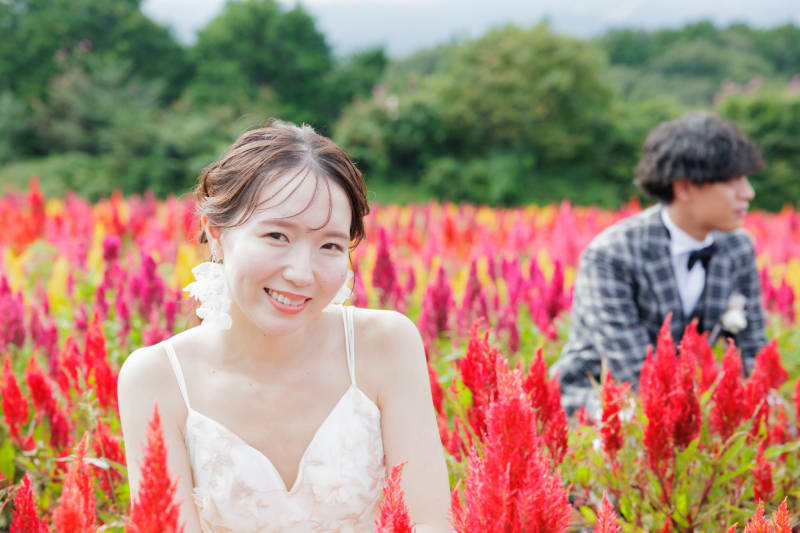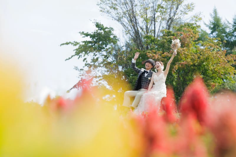季節の花々に囲まれたロケーションで撮影することで、ドレスの持つ可憐さがより引き立ち、まるで女神のような装いになります。