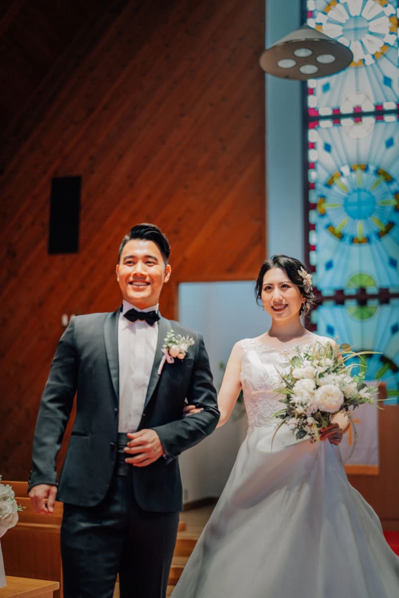 王道Aラインドレスと神聖なステンドグラスが合わさると、クラシカルかつ荘厳な雰囲気に。