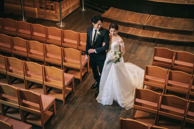 可愛らしい印象が強いハートカットのウェディングドレスですが、シックなチャペルで着用することで、洗練された雰囲気と上品さを両立した着こなしが叶いますよ。