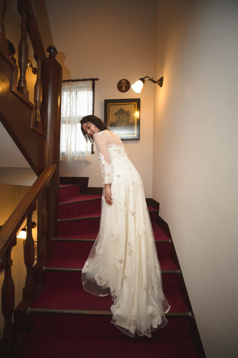 クラシカルでロマンチックな雰囲気は、アンティークスタジオとの相性が抜群。シックなアンティーク家具や空間に佇むだけで物語が始まりそうな一着に。