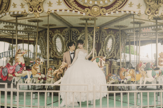 パーク内の『おとぎの国』にある観覧車やメリーゴーランドなど、カラフルで可愛らしい背景は、ポップで楽しい雰囲気の撮影にぴったりです。撮影後には、デート気分で季節のフルーツ狩りを楽しむのもいいかも?