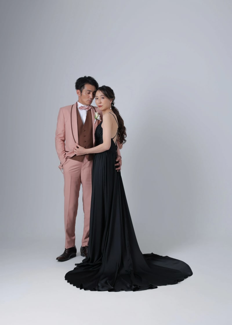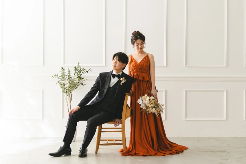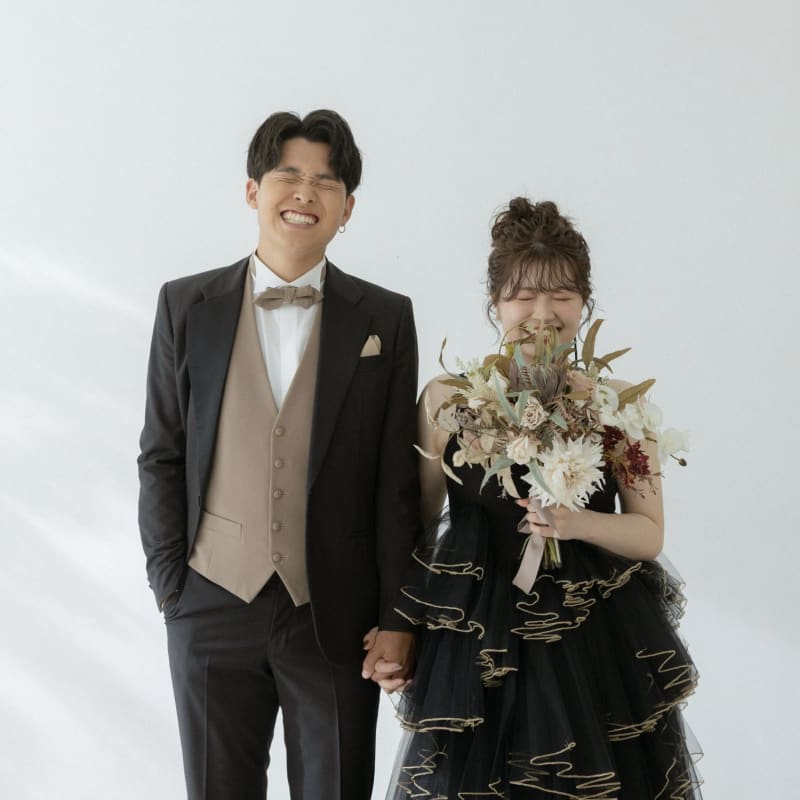 ご新婦様は、輝きを放つゴールドやシャンパンカラーのドレスや黒いウェディングドレスなど派手めなカラーを取り入れてもお互いが魅力的に写ります。また、純白のドレスでも、コントラストが際立ち、モダンな印象に仕上がります。