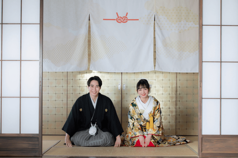 和装撮影の格安プラン。新郎新婦ともに和装のレンタル代が含まれています。シンプルな背景のスタジオで正統派の婚礼写真を残せるので、両親や祖父母への結婚報告やハガキなどにも利用しやすいショットが撮影できるでしょう。