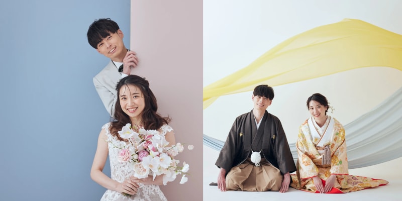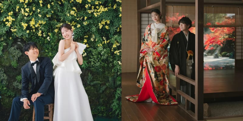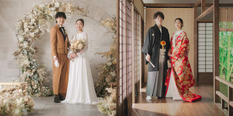 フォトジェニックな特別スタジオで洋装と和装のどちらの撮影も叶うプラン。和装では本格的な屋内庭園スタジオ、洋装では花に囲まれたハウススタジオとそれぞれ撮影場所も異なるため、さまざまな雰囲気のカットを撮影できます。