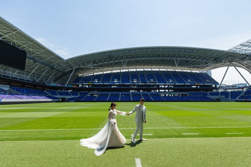 日本初のまちなかスタジアムとして開業したエディオンピースウイング広島内での撮影プランです。コスパよくスタジアムを貸し切って撮影できるのが魅力! スタジアムならではの迫力満点の写真や裏側での撮影が楽しめるため、サッカー好きにはたまらないひとときとなるでしょう。