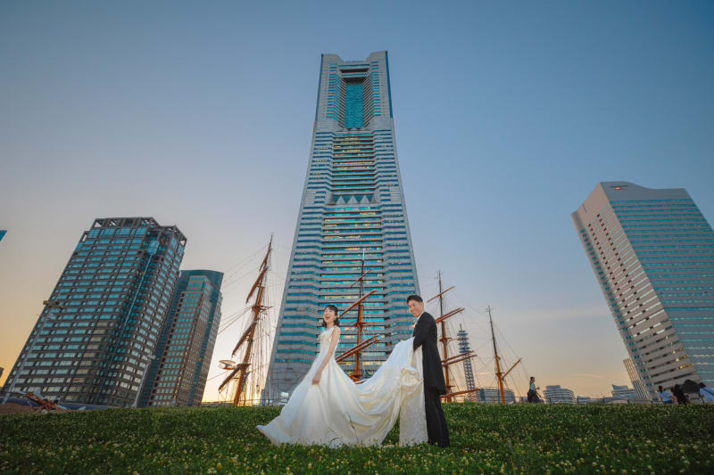 横浜港のシンボル「帆船日本丸」を望む、日本丸メモリアルパークでのロケーション撮影も6万円台からです。ランドマークタワーの真下でコスモクロックを間近に、潮風を感じてのサンセット撮影や、横浜らしい夜景を背景にした撮影が叶いますよ。