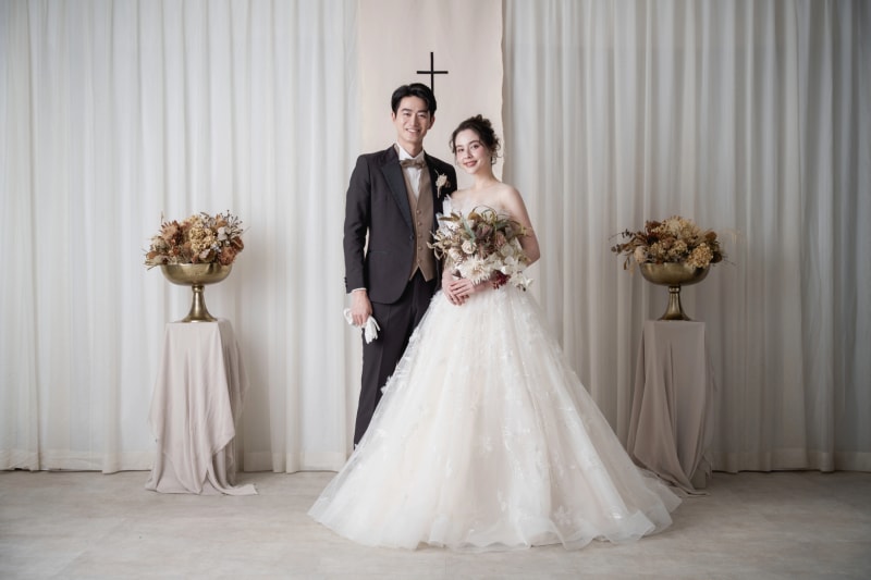 憧れのチャペルフォトが叶えられるコスパ最強プラン。ハウススタジオ内に併設されたチャペルは柔らかな光で包まれ、ウェディングドレス姿がより一層美しく華やかに写ります。