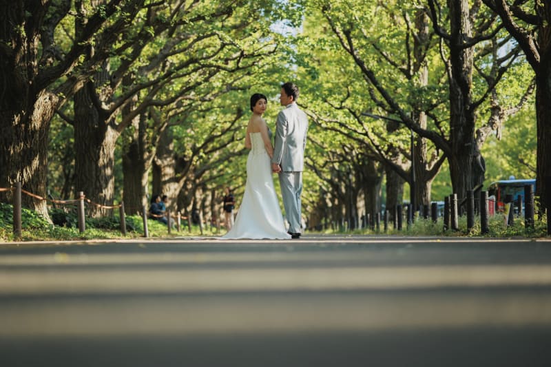 洋装でのフォトウェディングを、おしゃれに安く仕上げたい方は外苑前並木ロケーションプランがおすすめ! 300mのイチョウ並木が一直線に続くロケーションは、初夏の新緑はもちろん、秋には紅葉の神々しい雰囲気となり、立ち姿だけで素敵なショットが叶います。