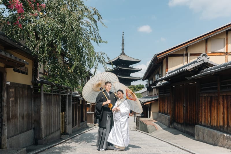 京都を象徴するスポット・八坂の塔をはじめ祇園エリアをめぐりながら撮影ができるフォトウェディングプラン。京都の古くから伝わる風情ある街並みで、和装の写真を残したい方におすすめですよ。