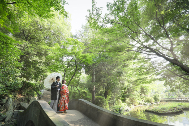 安く費用を抑えつつもロケーション撮影をしたい方におすすめのプランは、有栖川宮記念公園で和装撮影。広大な日本庭園には滝や渓流、池など自然豊かで、落ち着いた雰囲気のフォトウェディングができますよ。