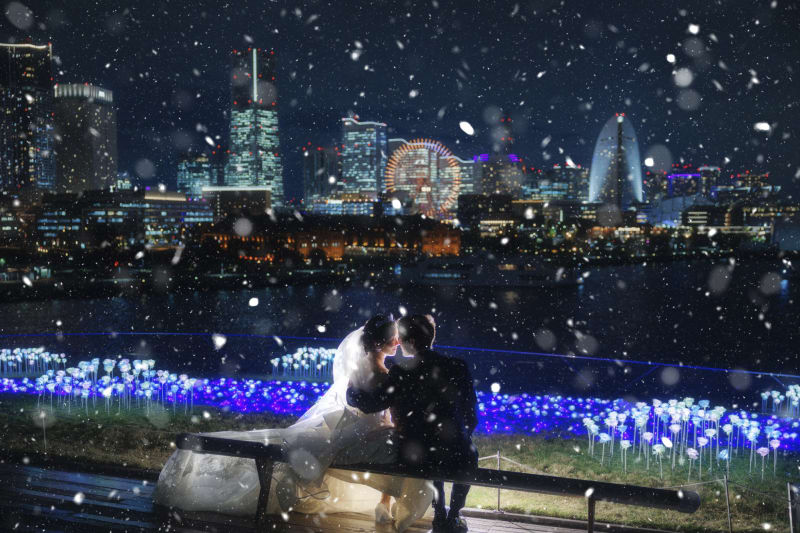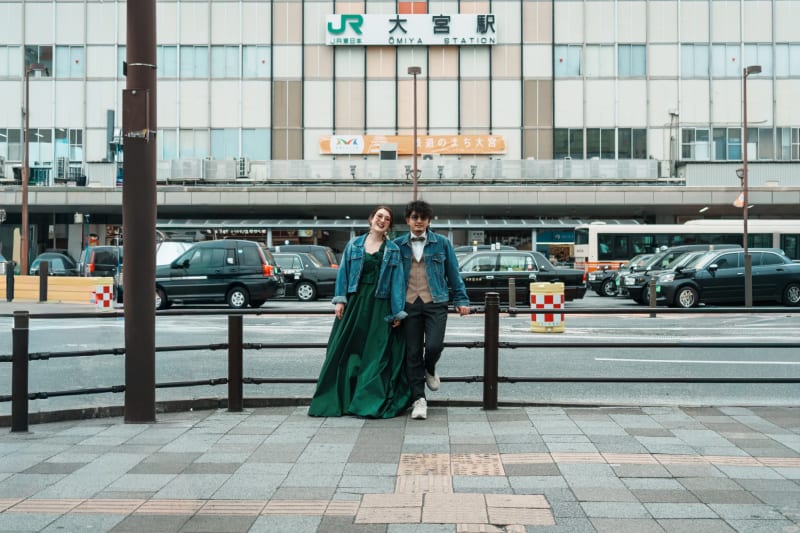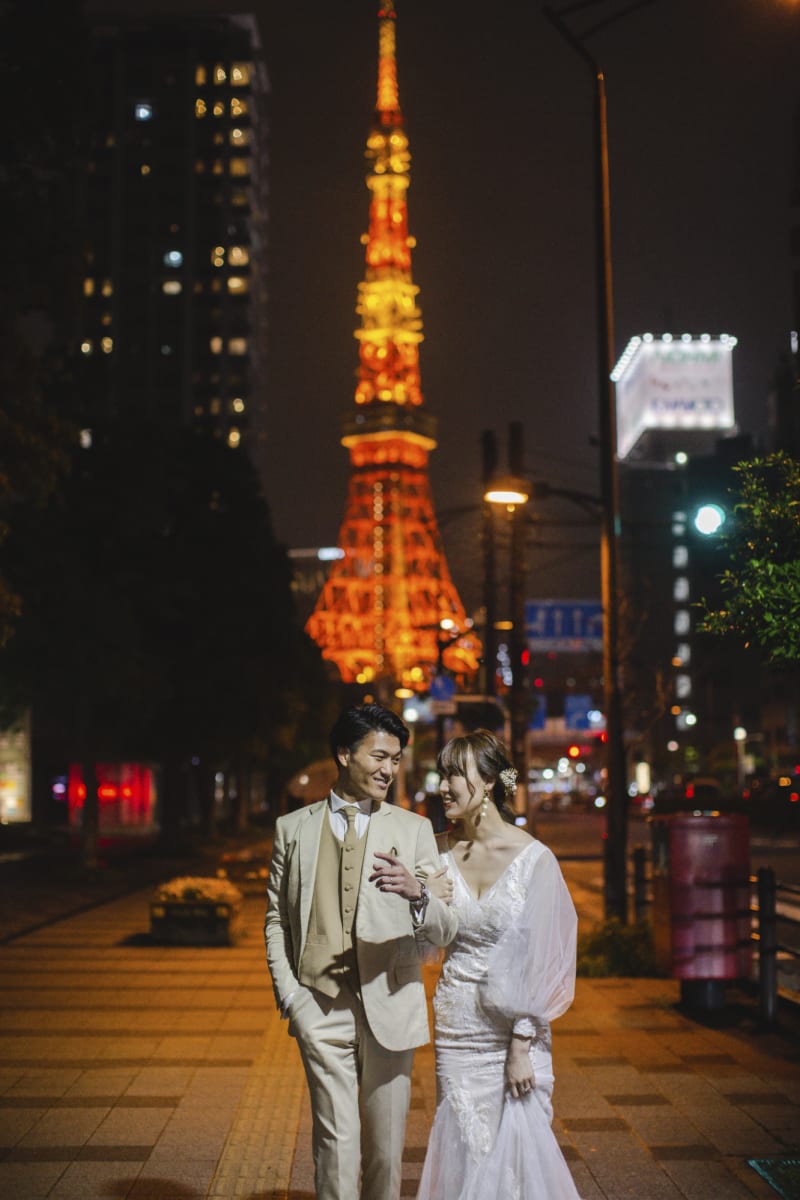渋谷に絶え間なく流れる車のライトや看板のネオン。あえてスローシャッターで背景を流し、雑踏の中でふたりだけが静止しているような「動と静」の対比でクールに決めましょう。