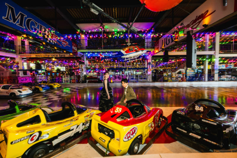 レトロなゲームセンターもフォトウェディングなら、サイバーパンクな雰囲気漂う夜の遊び場へと変貌。ビビットな光がドレスに反射し、エッジの効いたストリート風のスタイルが完成します。