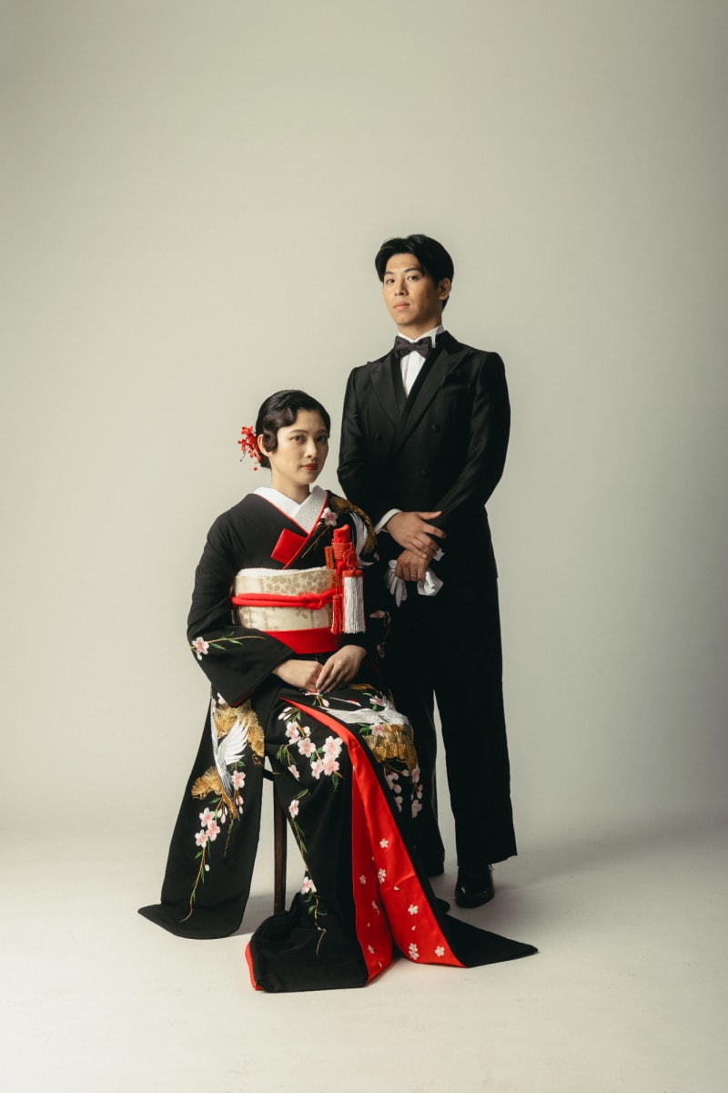 新婦は振り袖、新郎はタキシード、あるいはウェディングドレスに和小物を合わせるなど、あえて「和洋」をミックスするコーディネートもおすすめです。固定観念に縛られないスタイルは、知的でモダンなかっこよさを引き立てます。