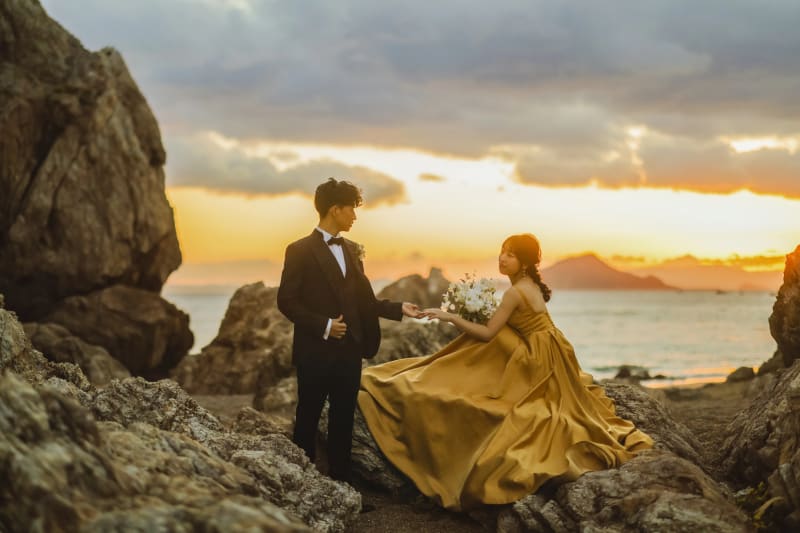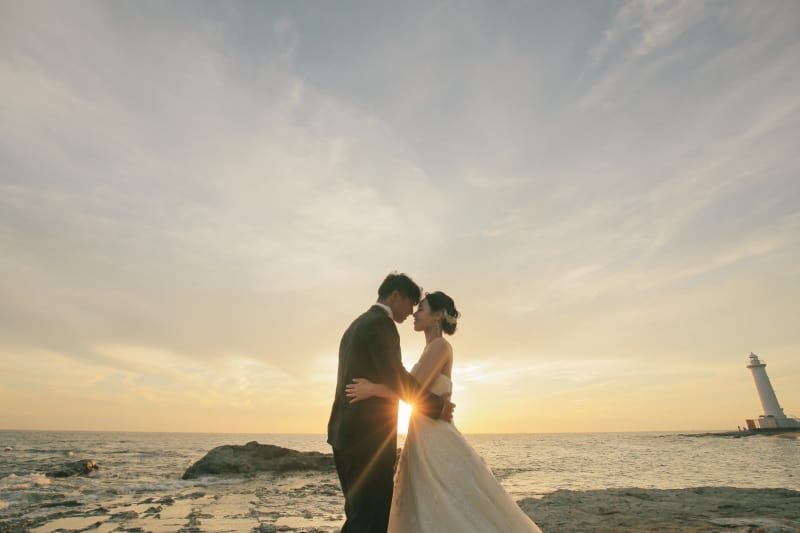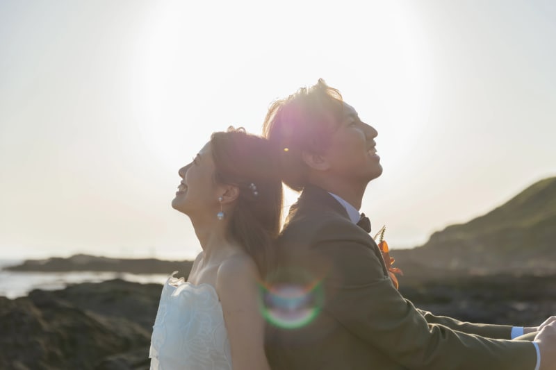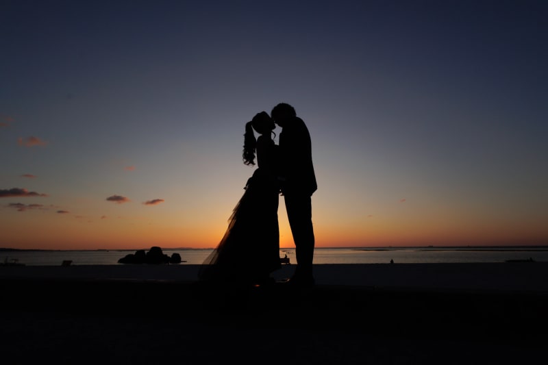 太陽が沈む直前、すべてが黄金色に輝く時間。逆光をふたりの輪郭にあてて、荘厳な一枚に。