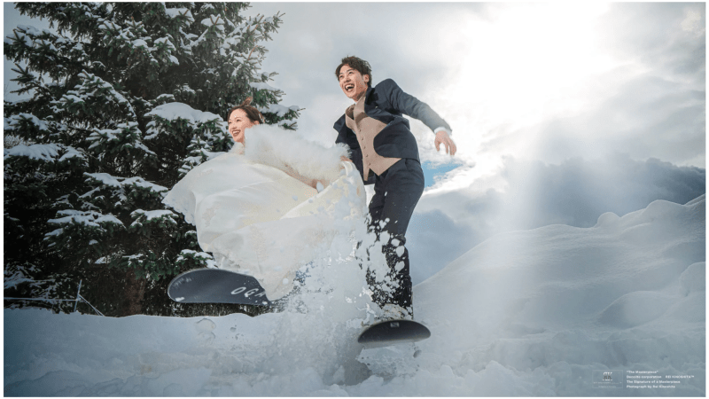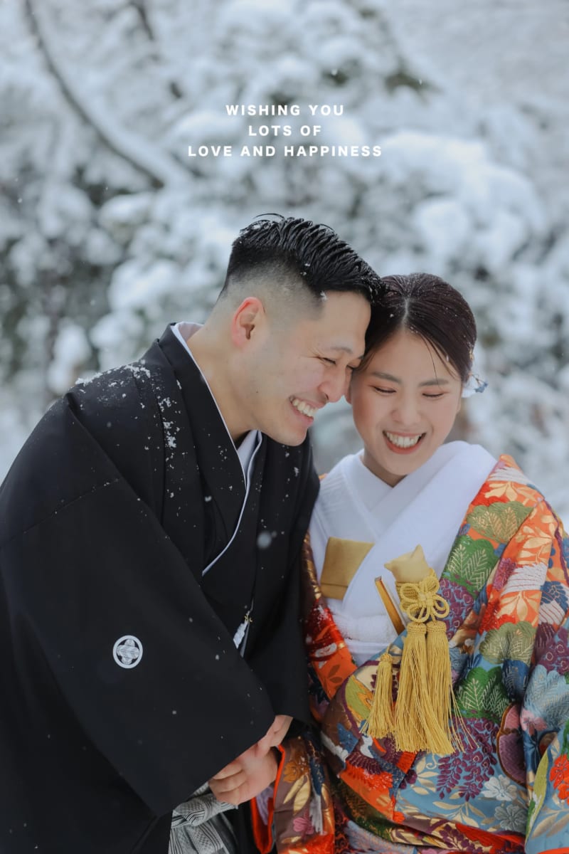 雪の日に映えるのは、鮮やかな和装の色彩。色打掛や紋付袴で揃えれば、凛としたかっこよさと、白銀の美しさとのアクセントを表現できます。
