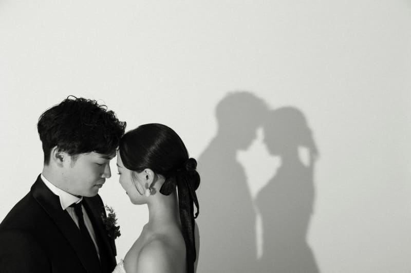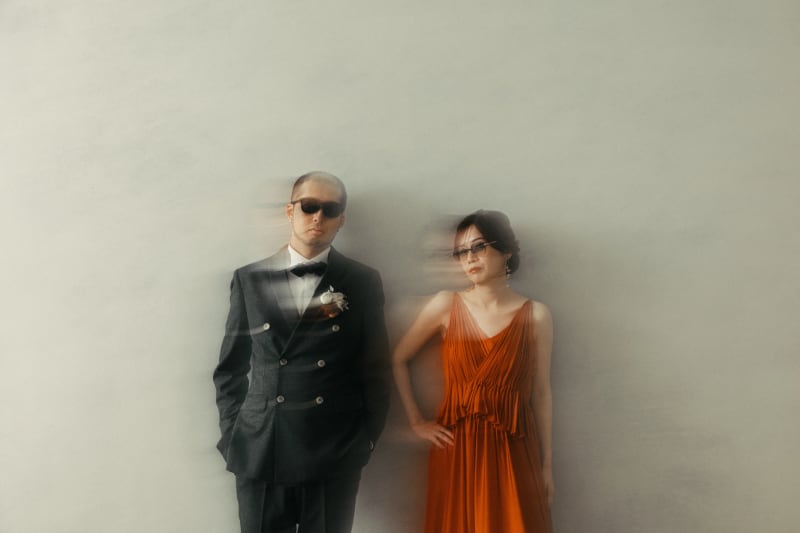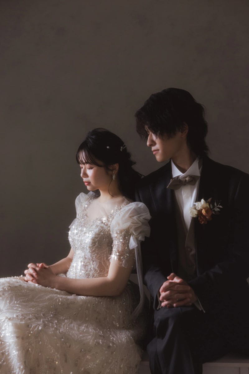 「カメラを意識していない瞬間」を作ることで、写真に深みと静寂が生まれます。ふたりあわせてアンニュイな表情を浮かべることで、映画のポスターのようなエモーショナルな一枚に。