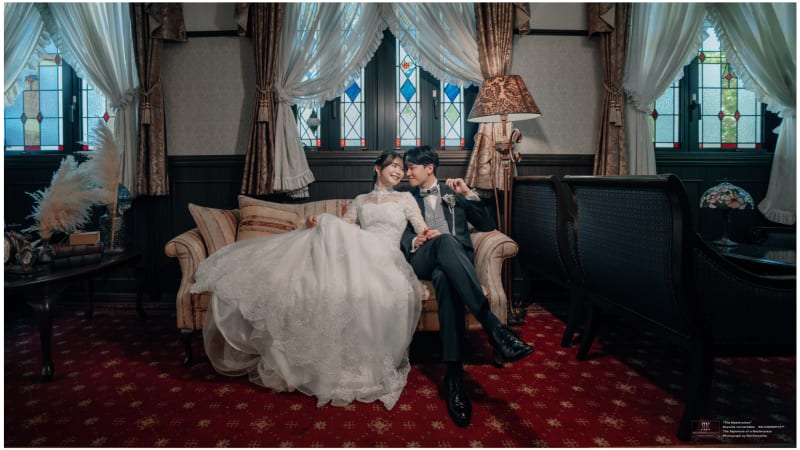 大人な雰囲気があるラウンジの琥珀色の照明、重厚な革張りのソファ。ブライダルフォトならではのシックな衣装で、かっこいいスパイスが効いた演出も素敵。