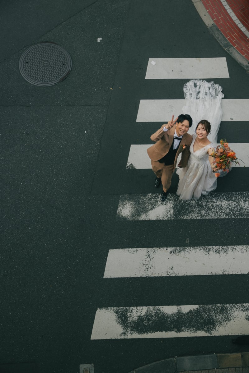 横断歩道はアートのテーマにも使われる場所。日常的なロケーションだからこそ、ウェディングドレス姿やタキシードが異彩を放ちます。手を繋いで颯爽と歩く姿は、海外のファッション誌のような一枚に。