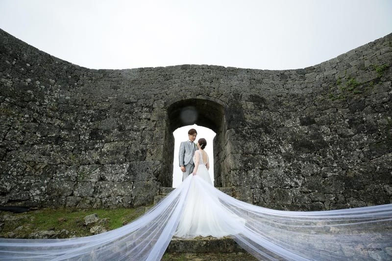 青い海とは対照的な沖縄の世界遺産・中城城跡。城跡の城壁を背景にすると、歴史を感じる壮大なブライダルフォトが叶います。
