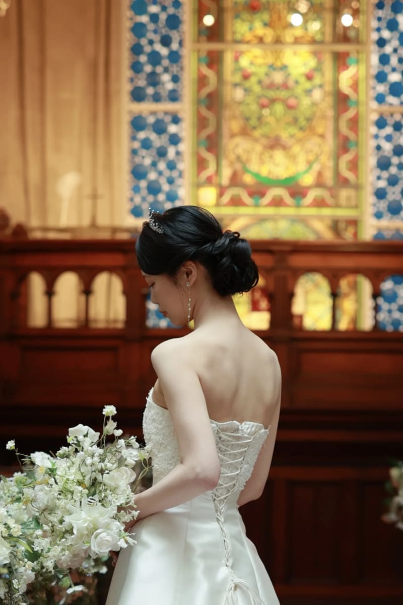 「ドレス撮影ではチャペルを背景にしたかった」という声も多数。静寂の中でバージンロードを歩く高揚感や、凛とした空気感に包まれた「チャペル×ドレス」のシーンは特別なものです。