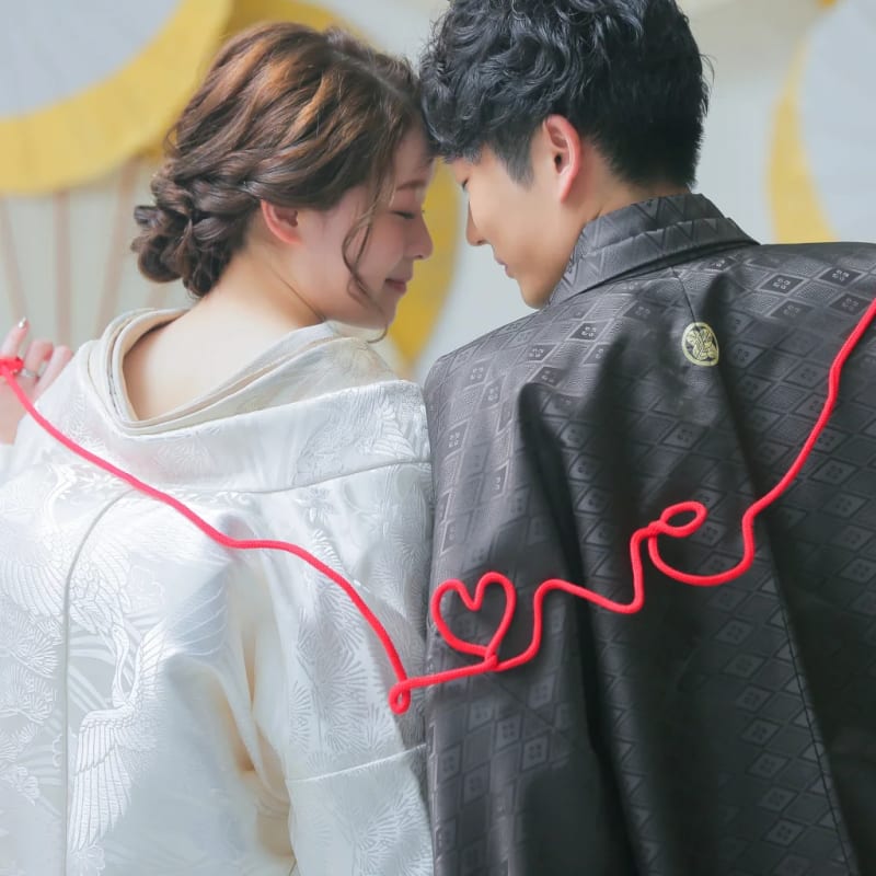 結婚の記念撮影ですので、恋人・夫婦をイメージさせる「ハートのオブジェ」や「赤い糸」などの小物を使うのもよいでしょう。