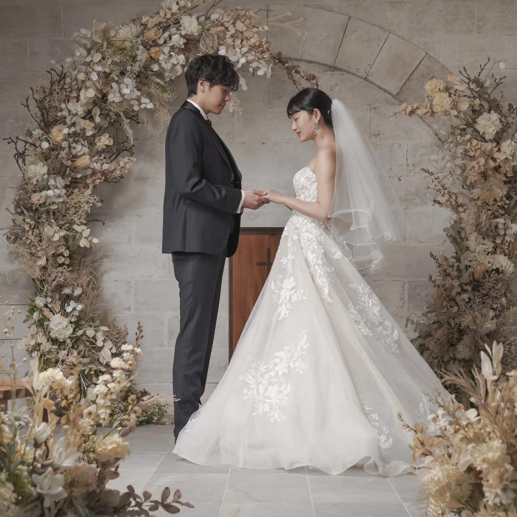 自然の中では難しい、ウェディングフォト専用に作り込まれた背景やおしゃれな背景での撮影が可能です。お城の壁を思わせるロマンチックな背景や、煌びやかにライトアップされた空間での撮影は、非日常的なシーンを撮影したいときにピッタリです。また、和装を検討している方であれば、日本の奥ゆかしさを感じられるような茶室セットで撮影することもおすすめです。