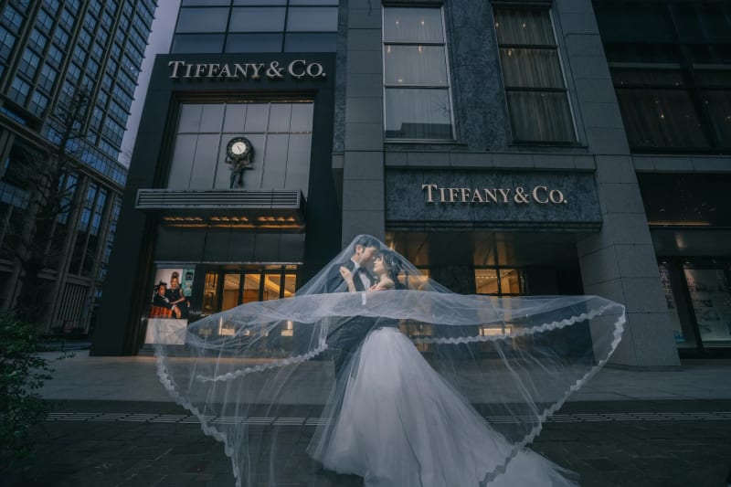 また、ロングベールをお二人で被るようなショットも、「二人だけの世界」を連想させてくれるので、ウェディングフォトにピッタリです。