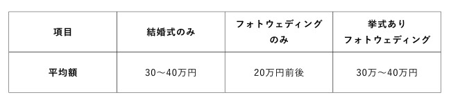 結婚式のみ、フォトウェディングのみ、挙式ありフォトウェディング、それぞれの平均費用は以下の通りです。