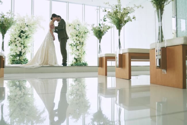 挙式ありのフォトウェディングは、専門会場のチャペルを借りてフォトウェディングを行う、もしくは少人数でのシンプルな挙式を行う前後に、スタジオでチャペル風フォトを撮影することが多いです。