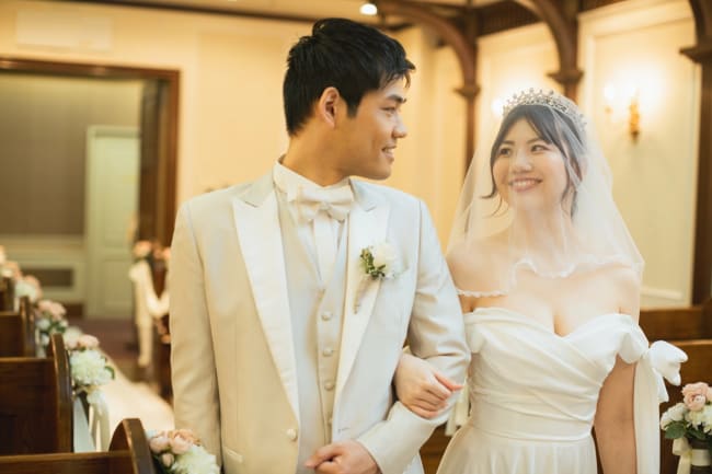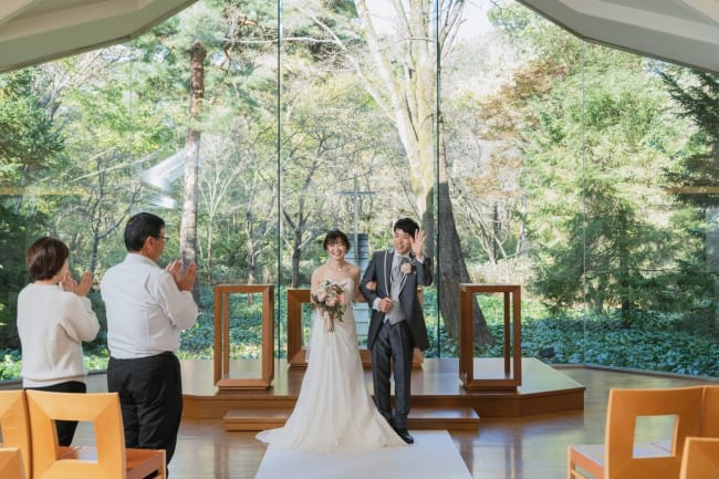 入場スタイルは自由なので、バージンロードを歩くほか、ダーズンローズ(新郎のゲストからバラを受け取りながら入場)の演出も選ぶことができます。ゲストとの一体感を得られるような入場は、双方にとって思い入れのあるシーンになるのでおすすめです。