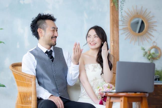 オンライン結婚式付きのフォトウェディングプランとは、写真撮影のほかに、Zoomなどのオンライン会議システムを使用し、スタジオなどから結婚式の様子を配信するものです。
