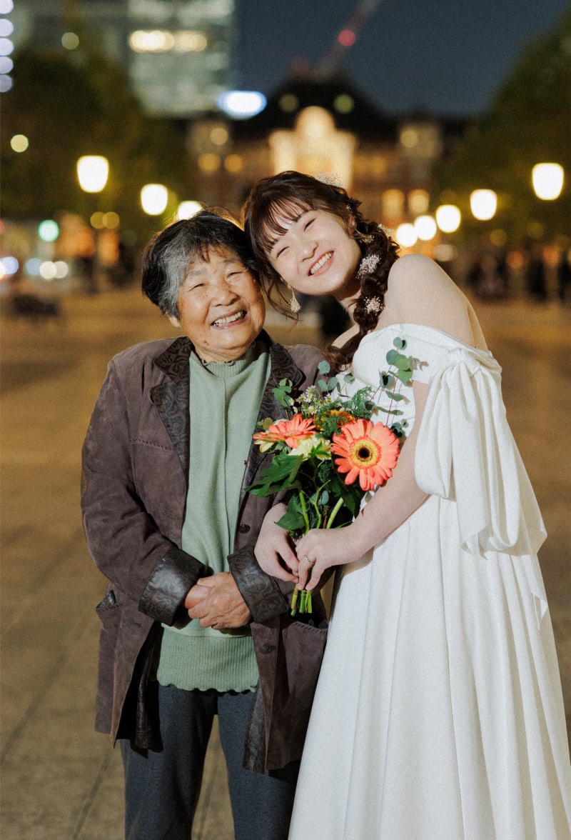 新婦とおばあちゃんの笑顔のツーショット。『近くで見ると泣いてしまうから大丈夫』と、集合写真では遠慮してなかなか近付いてくれなかったおばあちゃん。周りの声もあって、最高の笑顔を見せてくれました。2人の物理的な距離の近さと、似ている笑顔も印象的な1枚です。