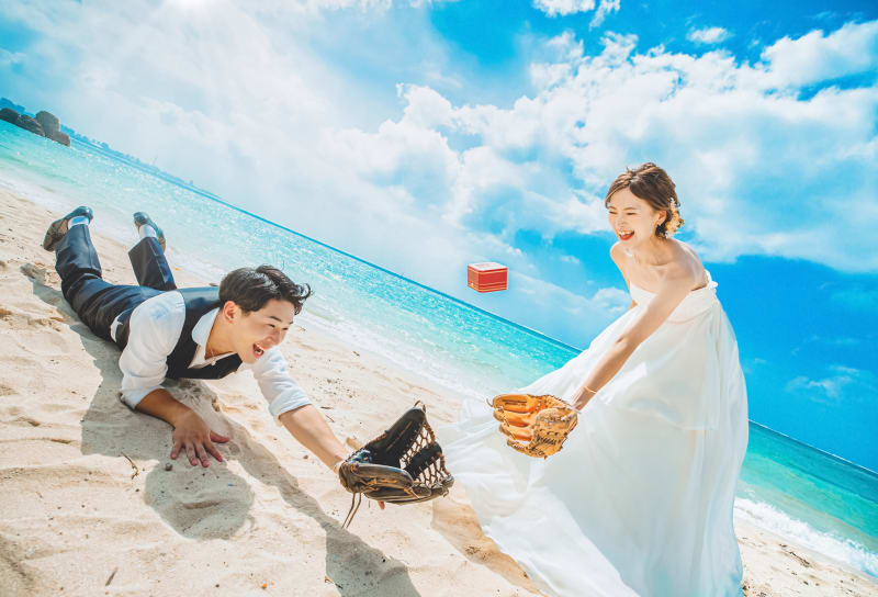 カップルが撮影日にボールを忘れてしまい、代わりにカルティエの指輪ケースをボールに見立てたことで、宝物を2人で取りにいくような写真になりました。