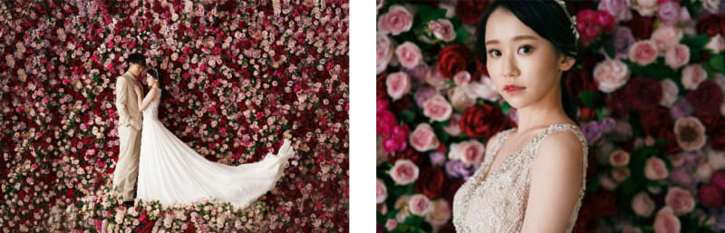 赤やピンク、ラベンダーカラーのお花が彩る背景は、お二人でのロマンチックなショットはもちろん、ご新婦様のソロショットにもぴったり。頭から足元まで全面お花に囲まれた写真が撮れるのが特徴で、ウェディングならではの特別感が溢れ、雰囲気のある写真が撮影できます。