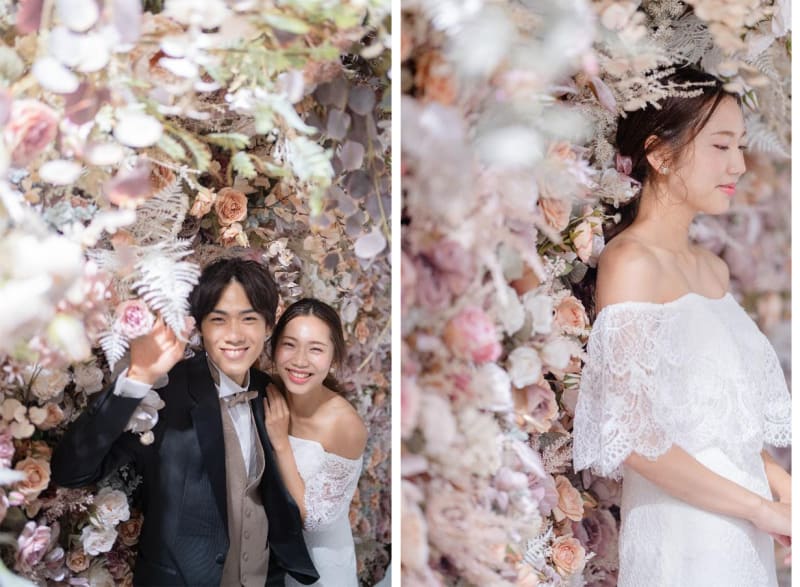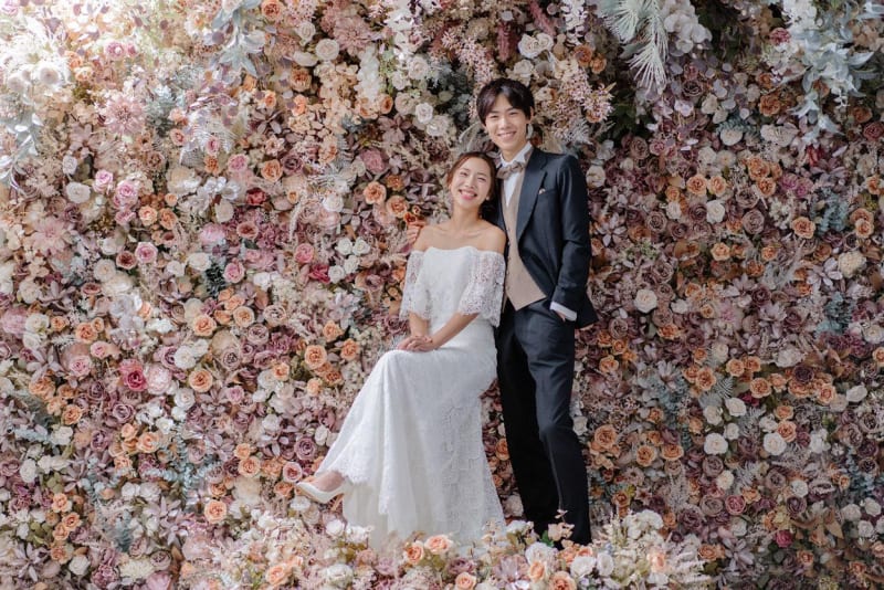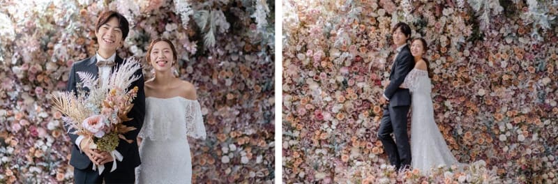 カラーのほか、立川店のフラワースタジオの特徴として、壁の上部にもお花のボリュームを持たせていることで、より立体感が生まれ、正面に限らず上からや横からといった、あらゆる角度で表情を変えて撮影をお楽しみいただけます。