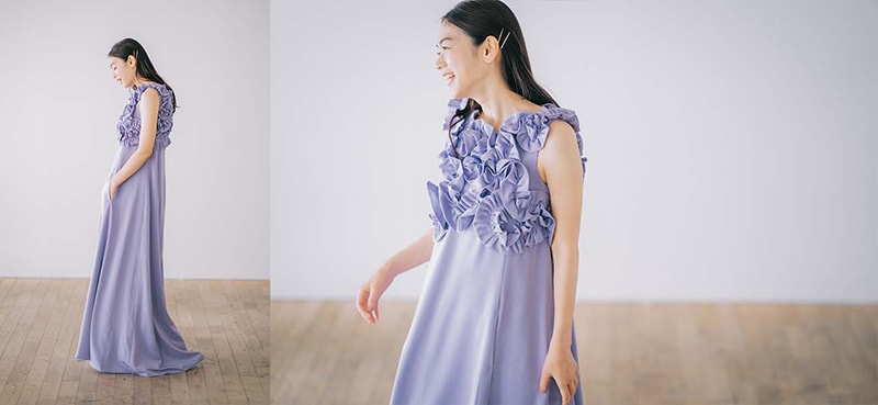 ランダムに施されたフリルが、顔周りを華やかに見せるスレンダードレス