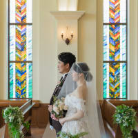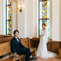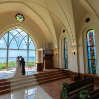 海が見えるクラシカルな教会と沖縄中部のビーチでの撮影をセットにした贅沢なプラン。ステンドグラスから差し込む光に...