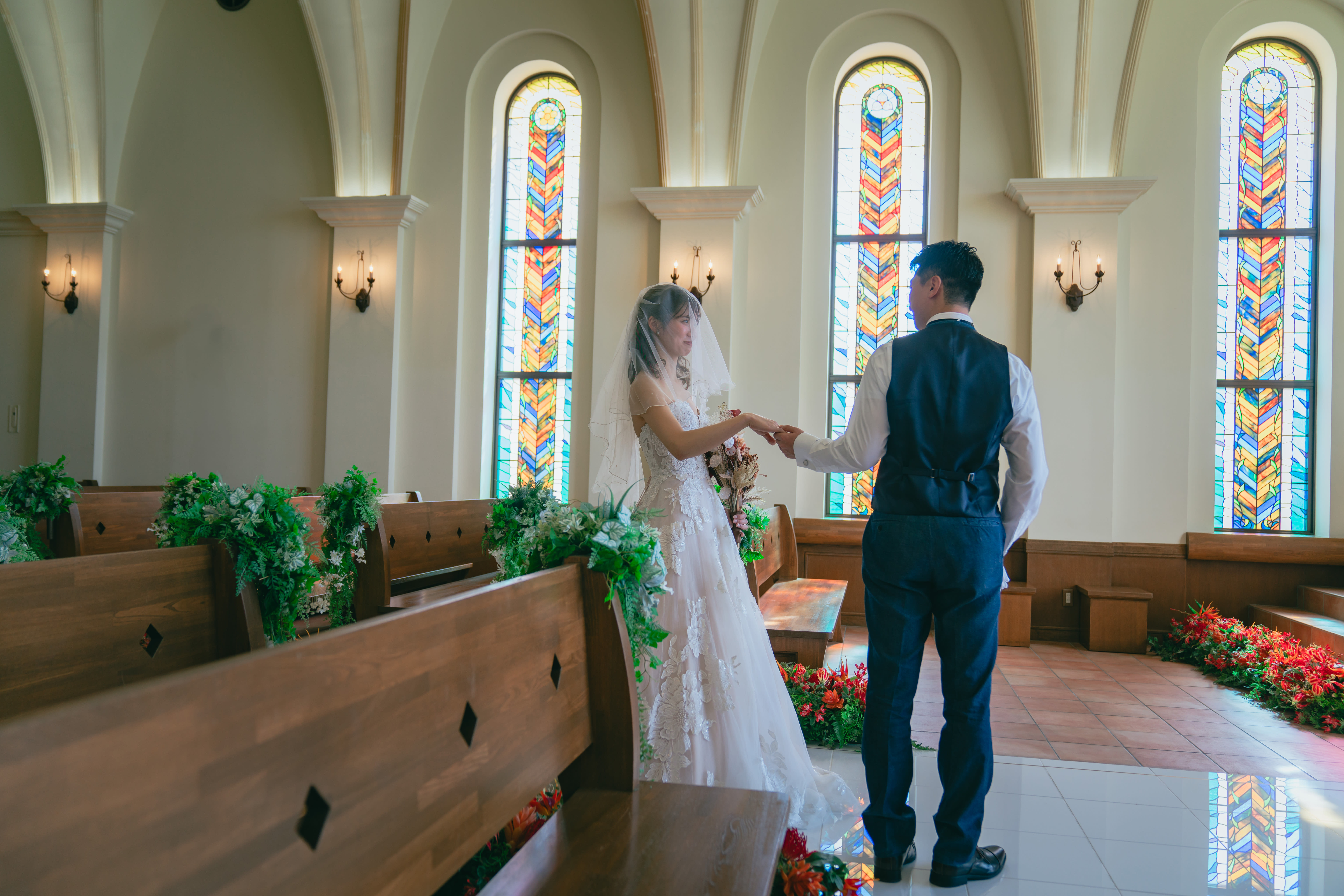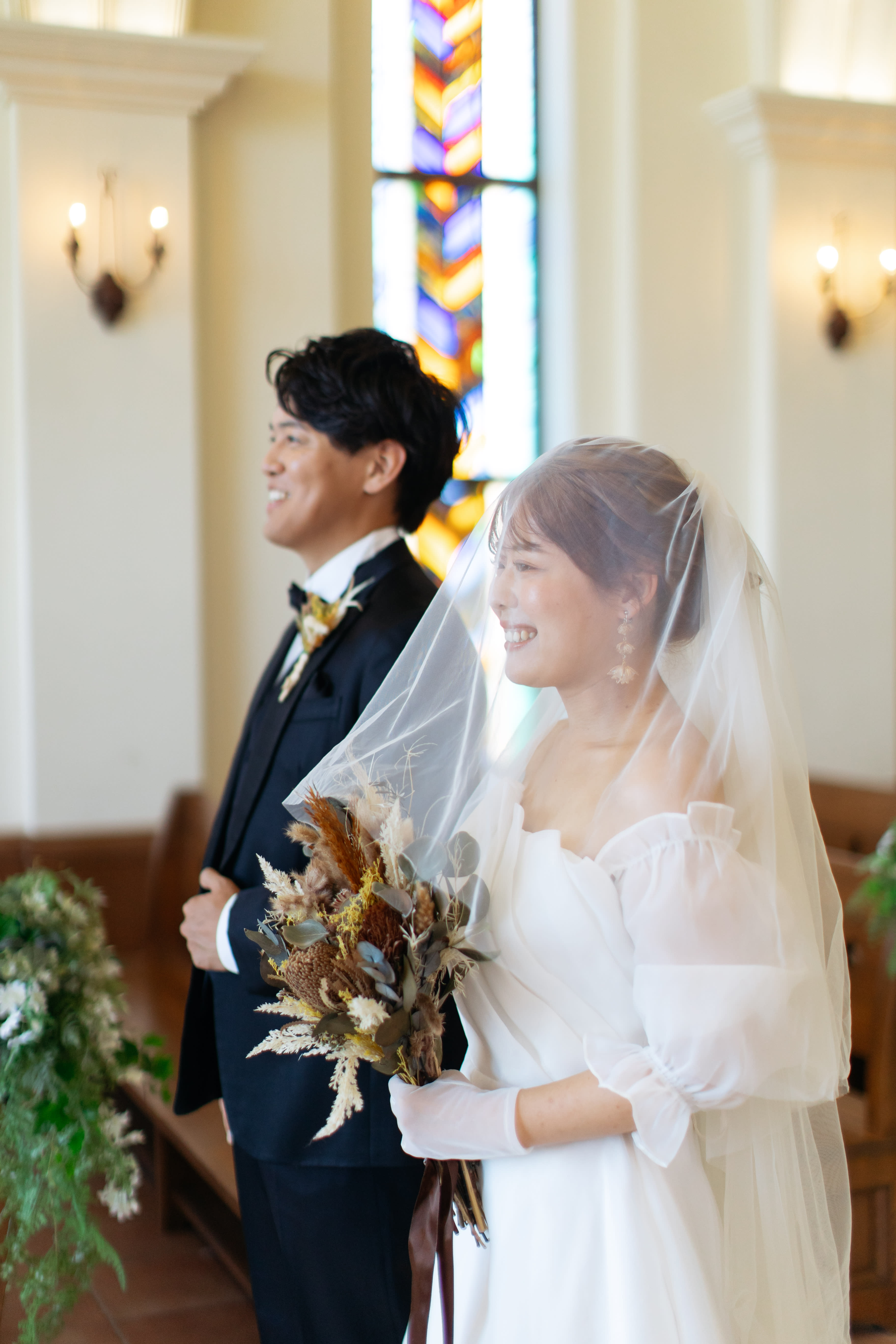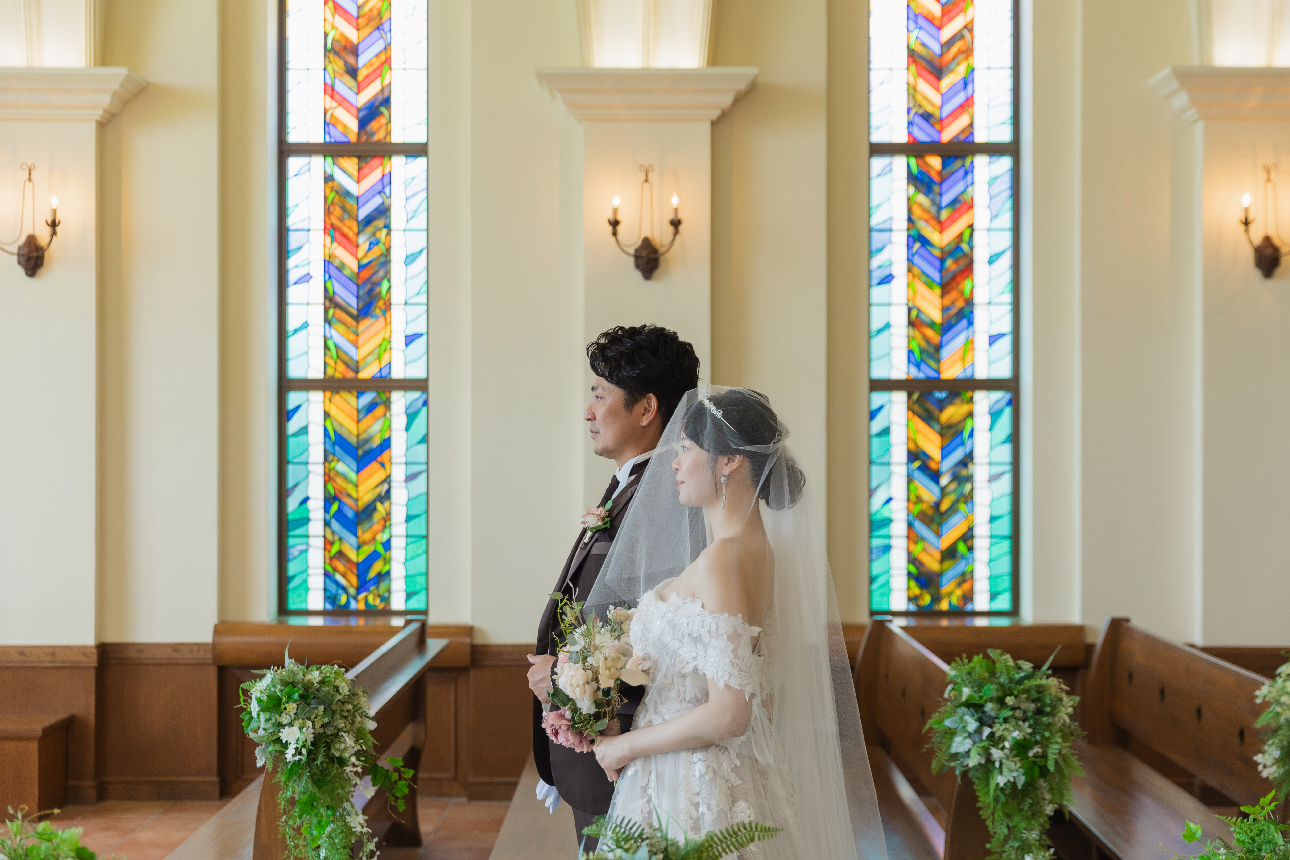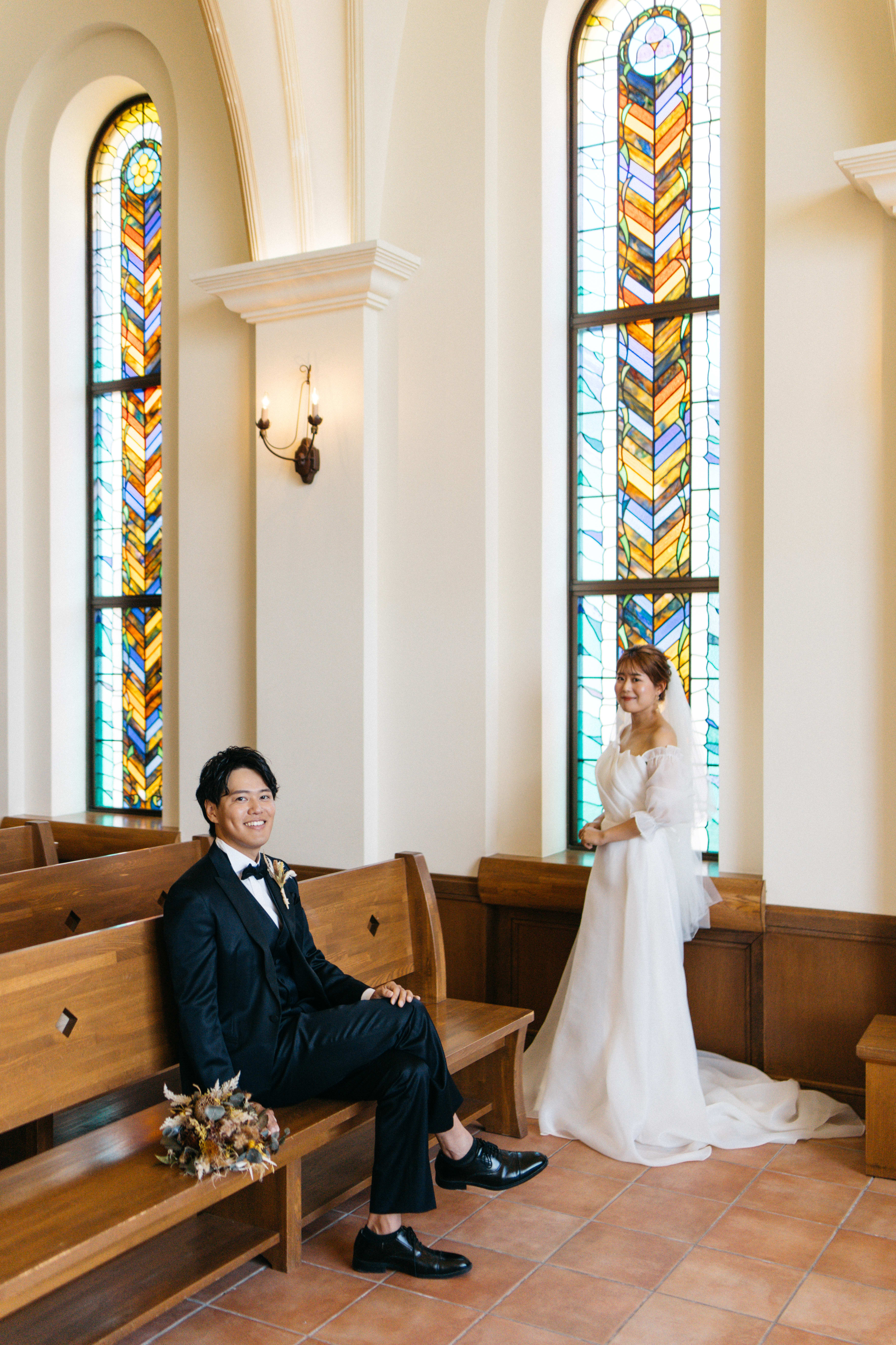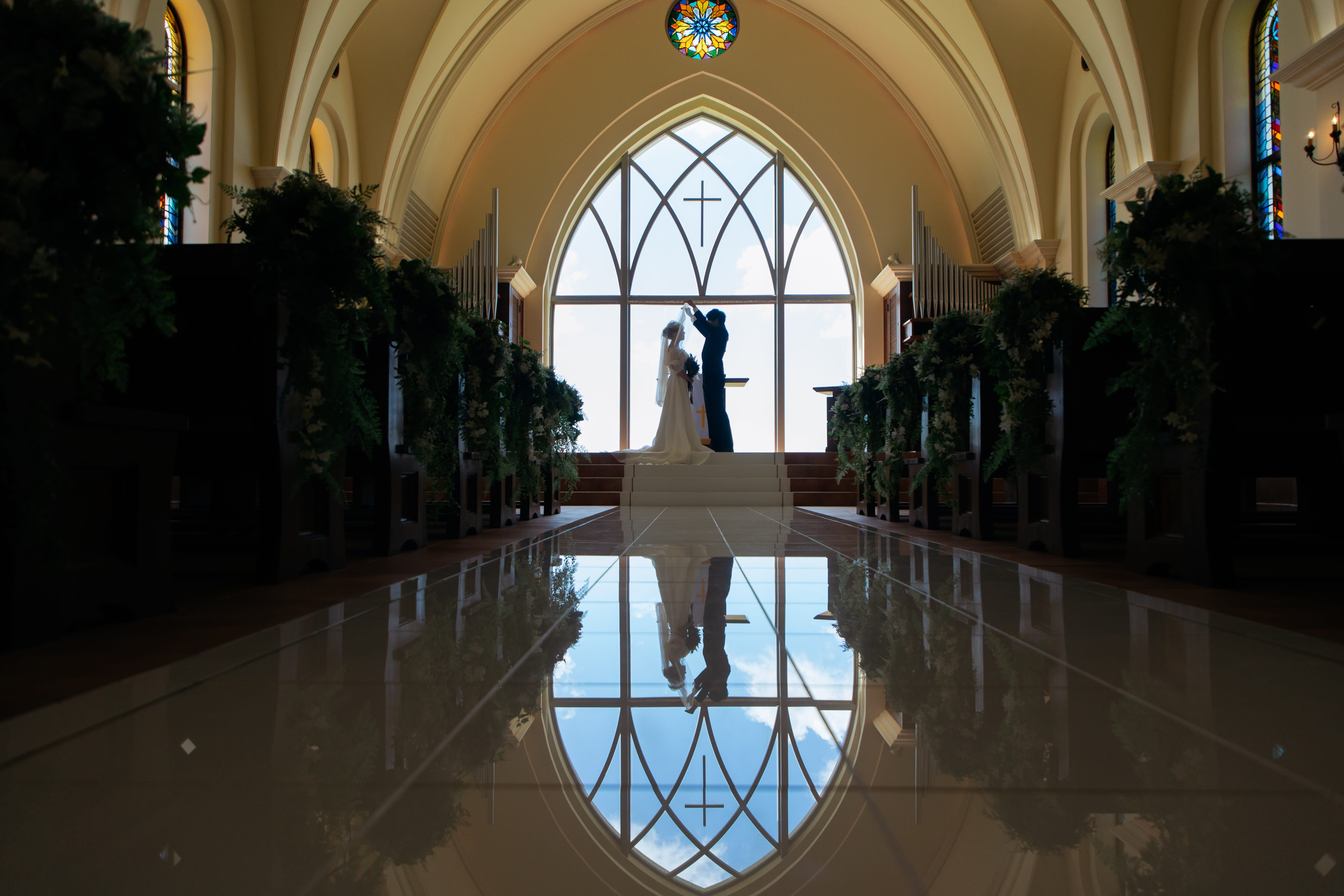 ステンドグラスから差し込む光に包まれるおふたりの姿は、まるで映画のワンシーンのよう。