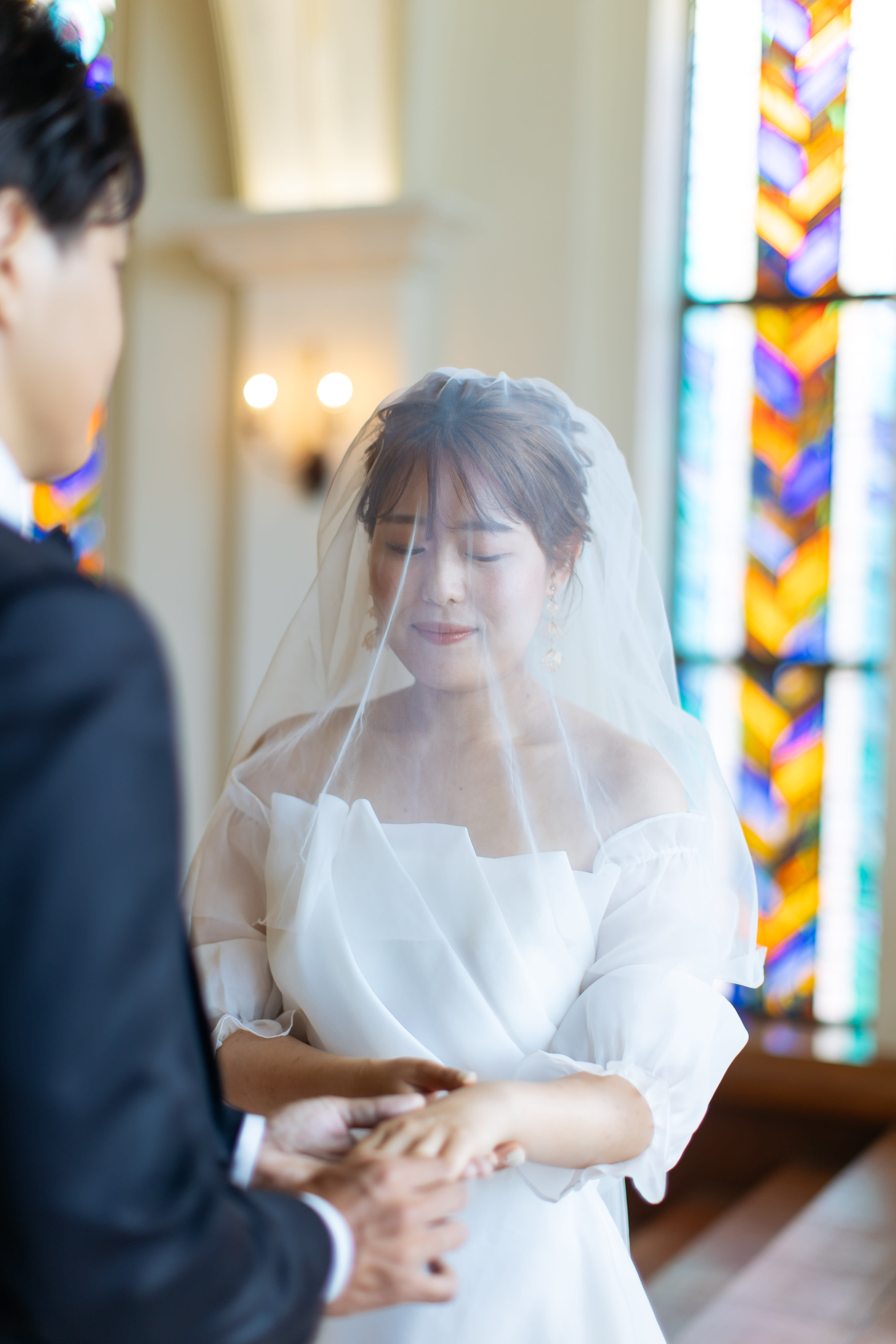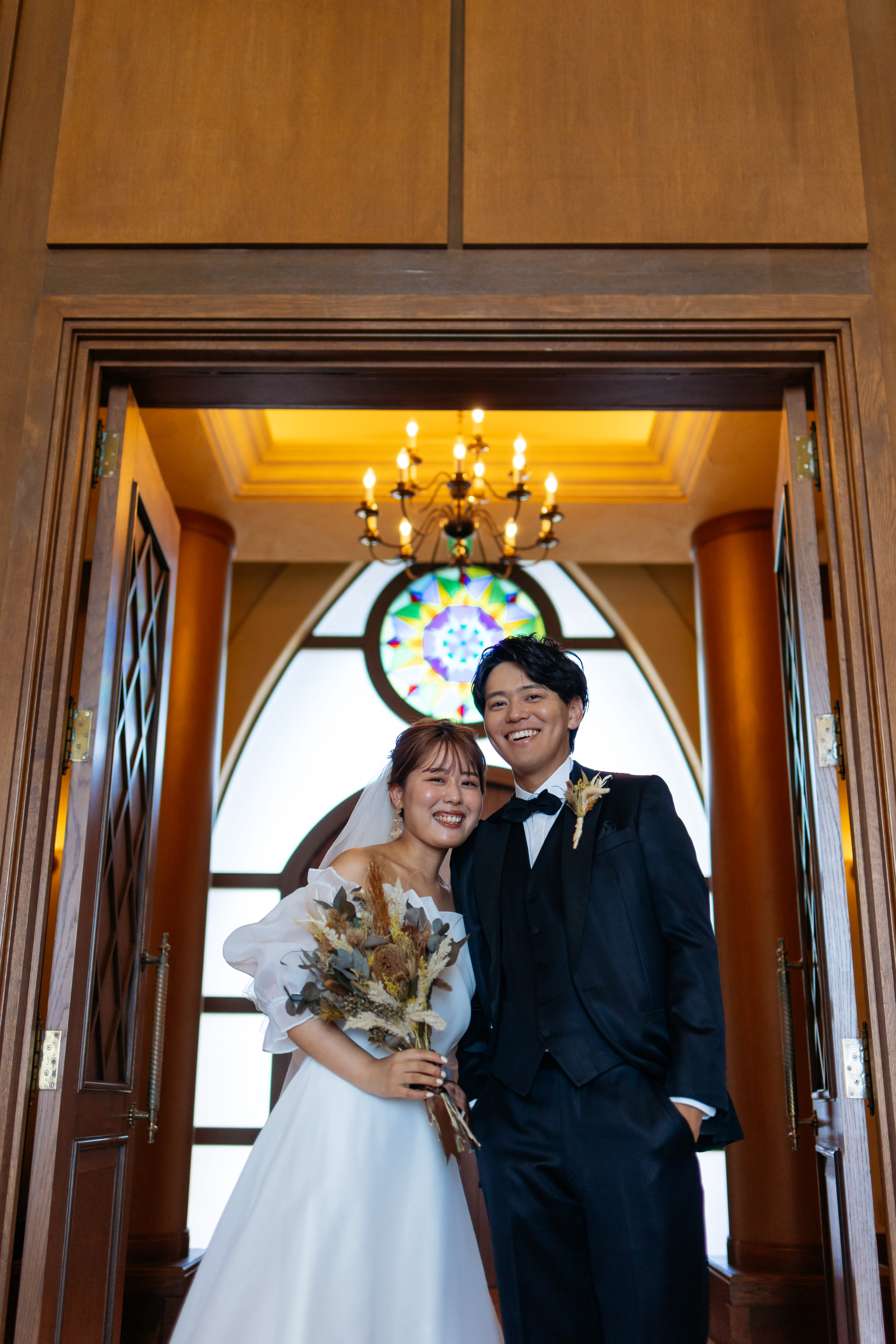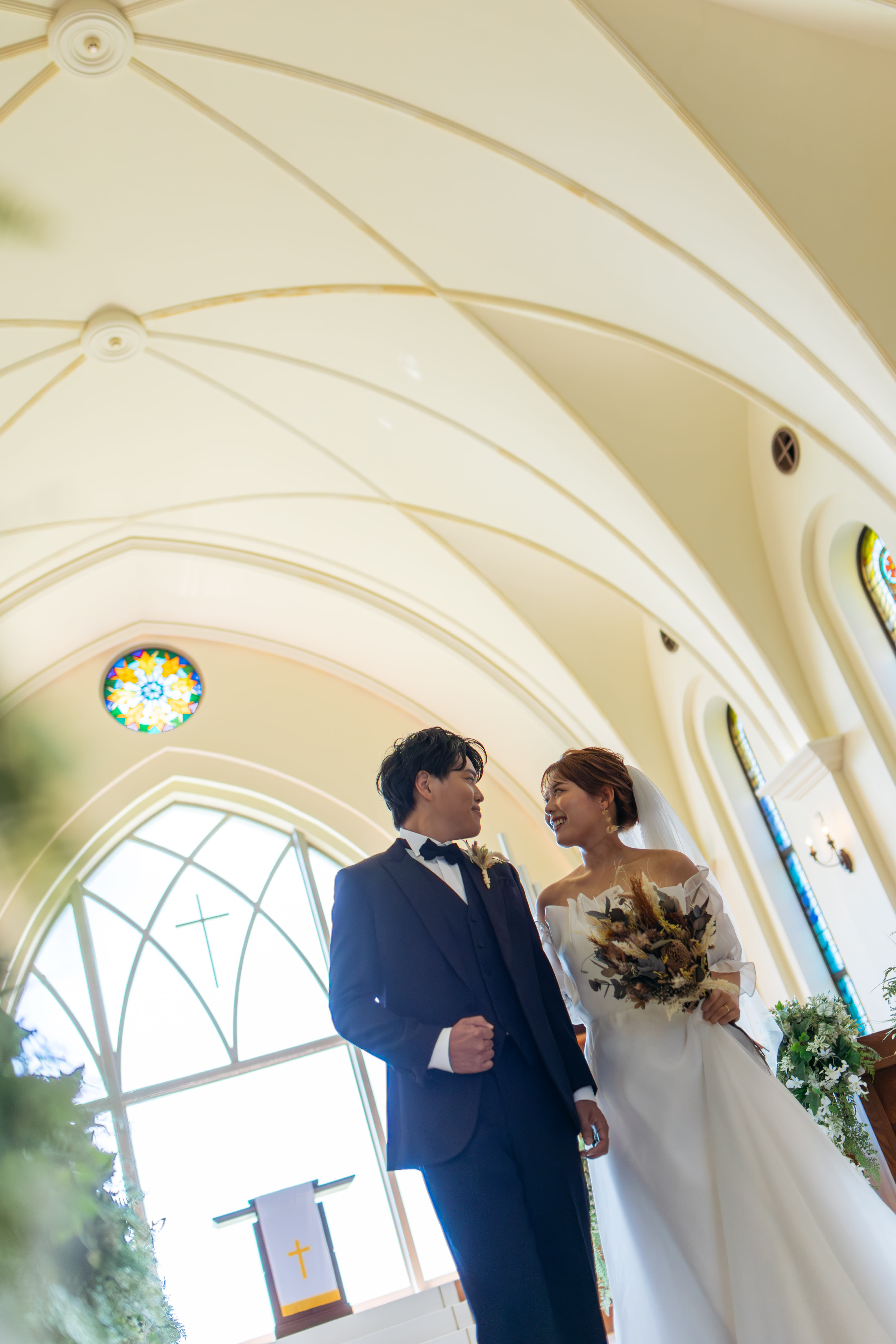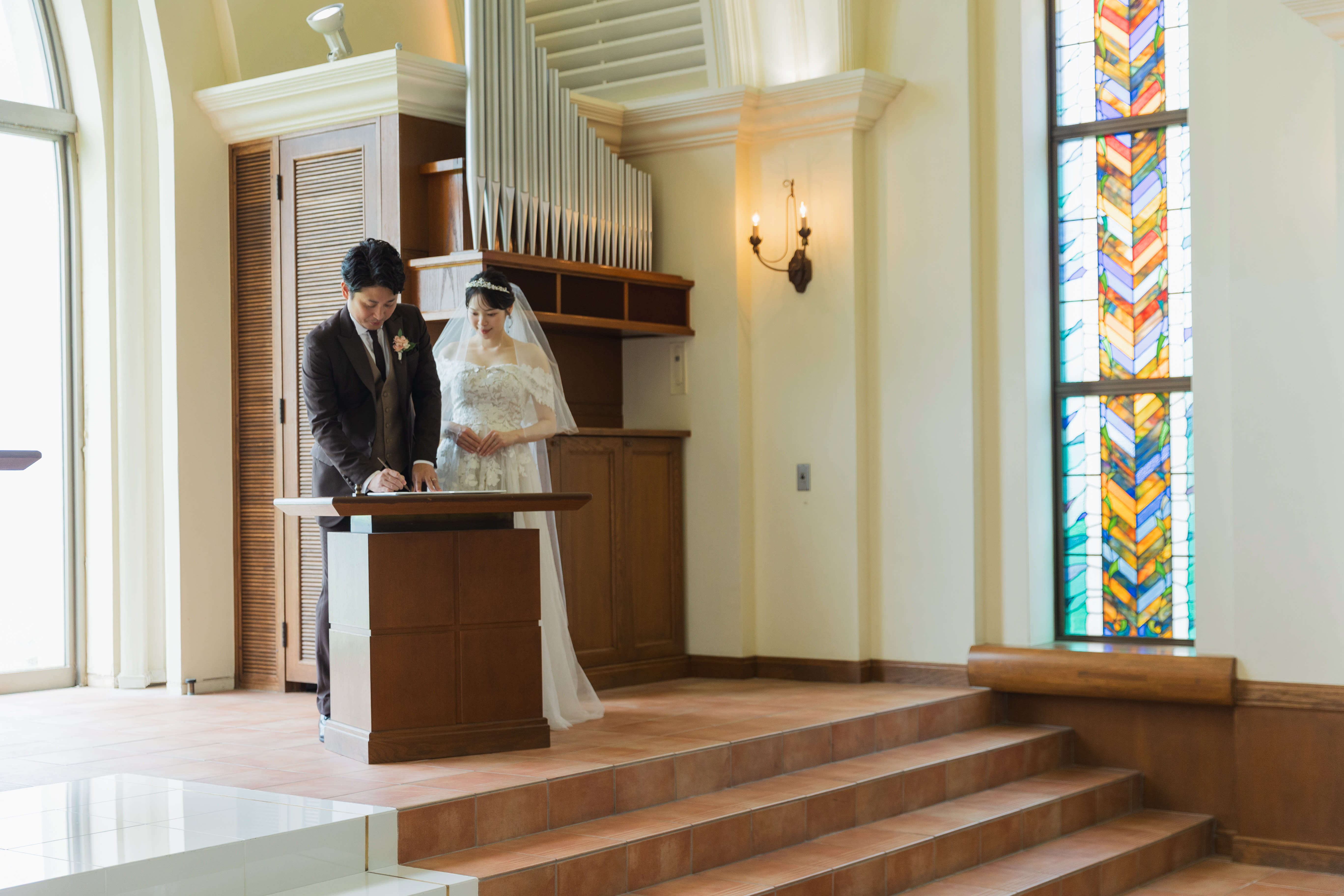 ステンドグラスから差し込む光に包まれるおふたりの姿は、まるで映画のワンシーンのよう。