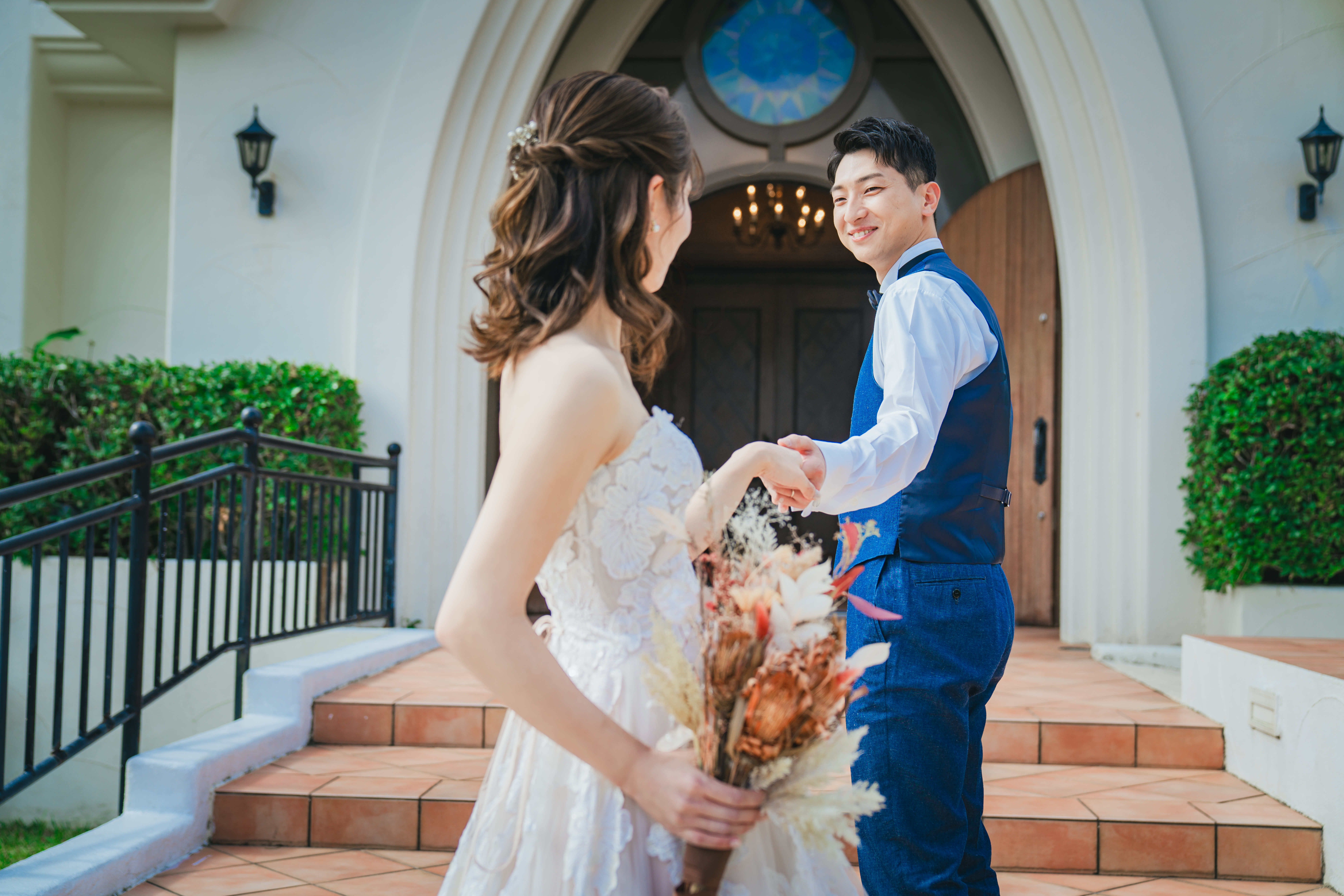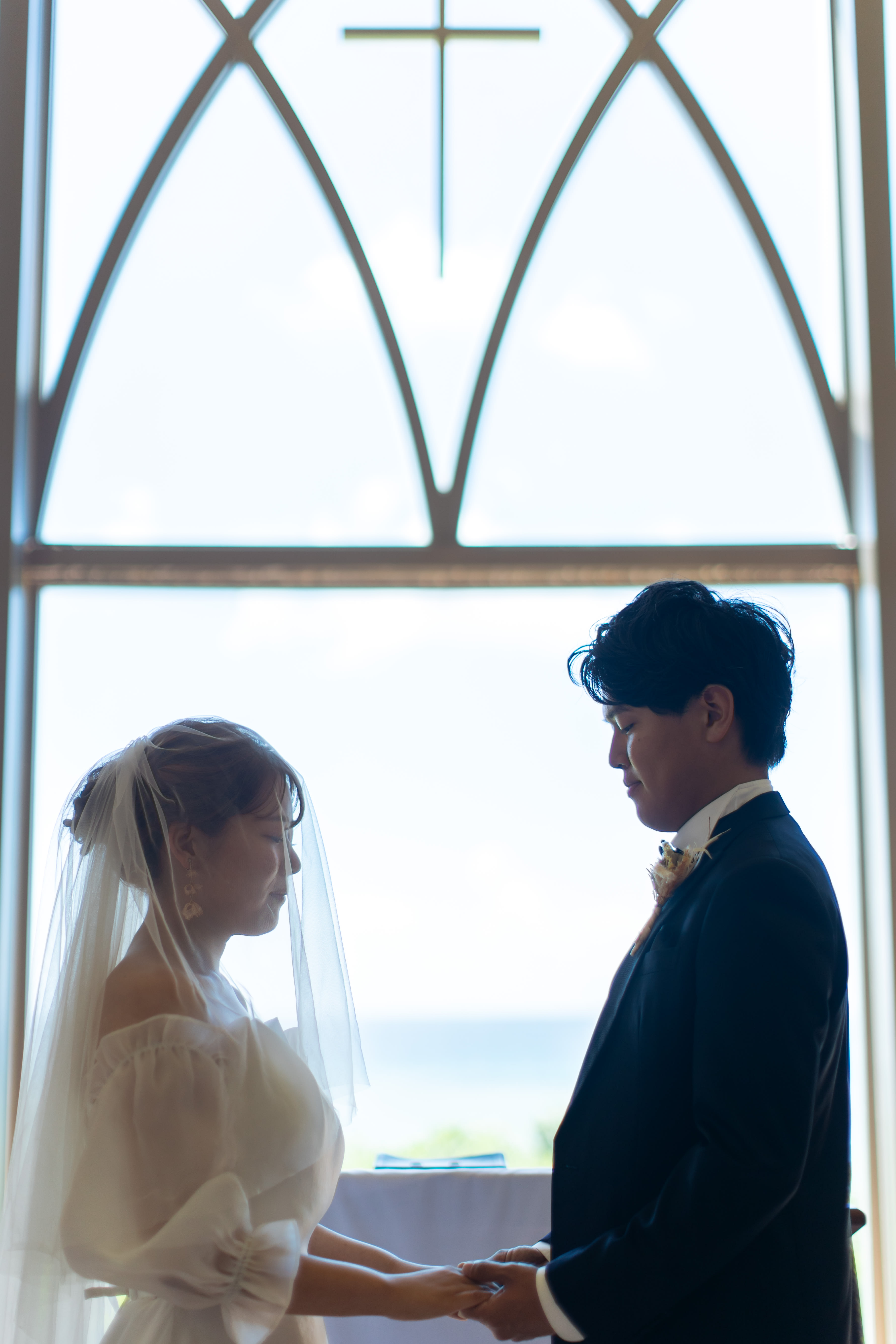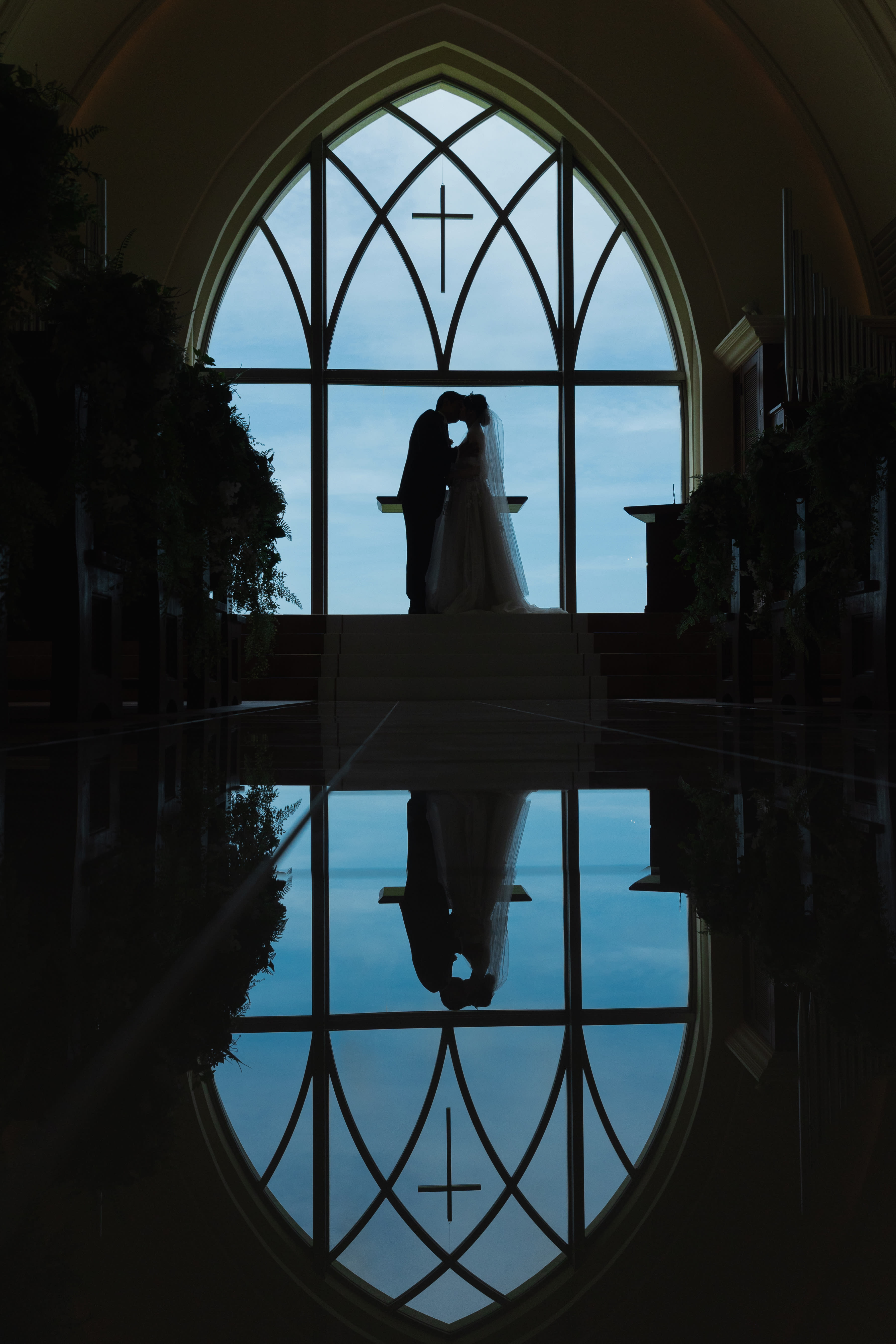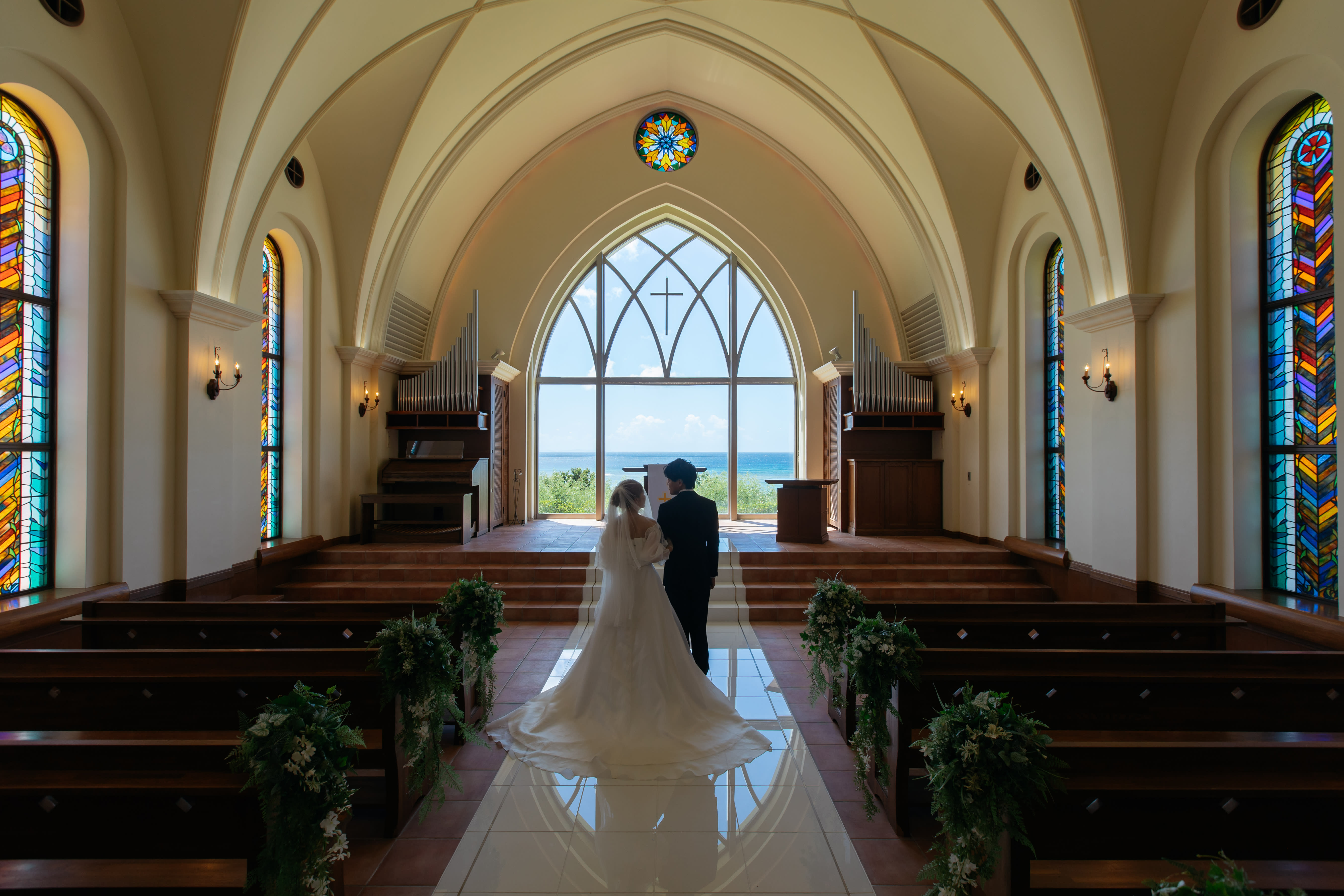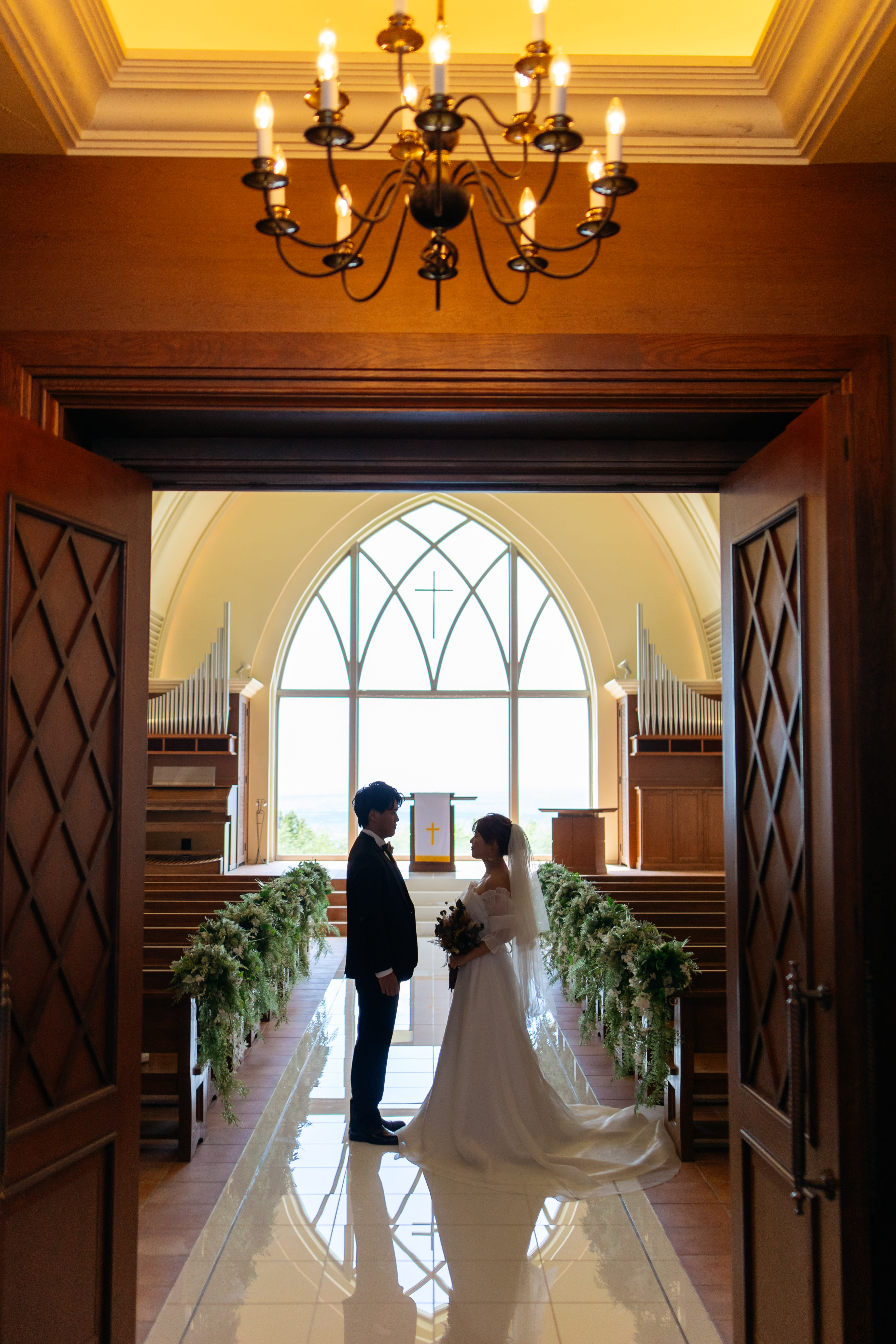 ステンドグラスから差し込む光に包まれるおふたりの姿は、まるで映画のワンシーンのよう。
