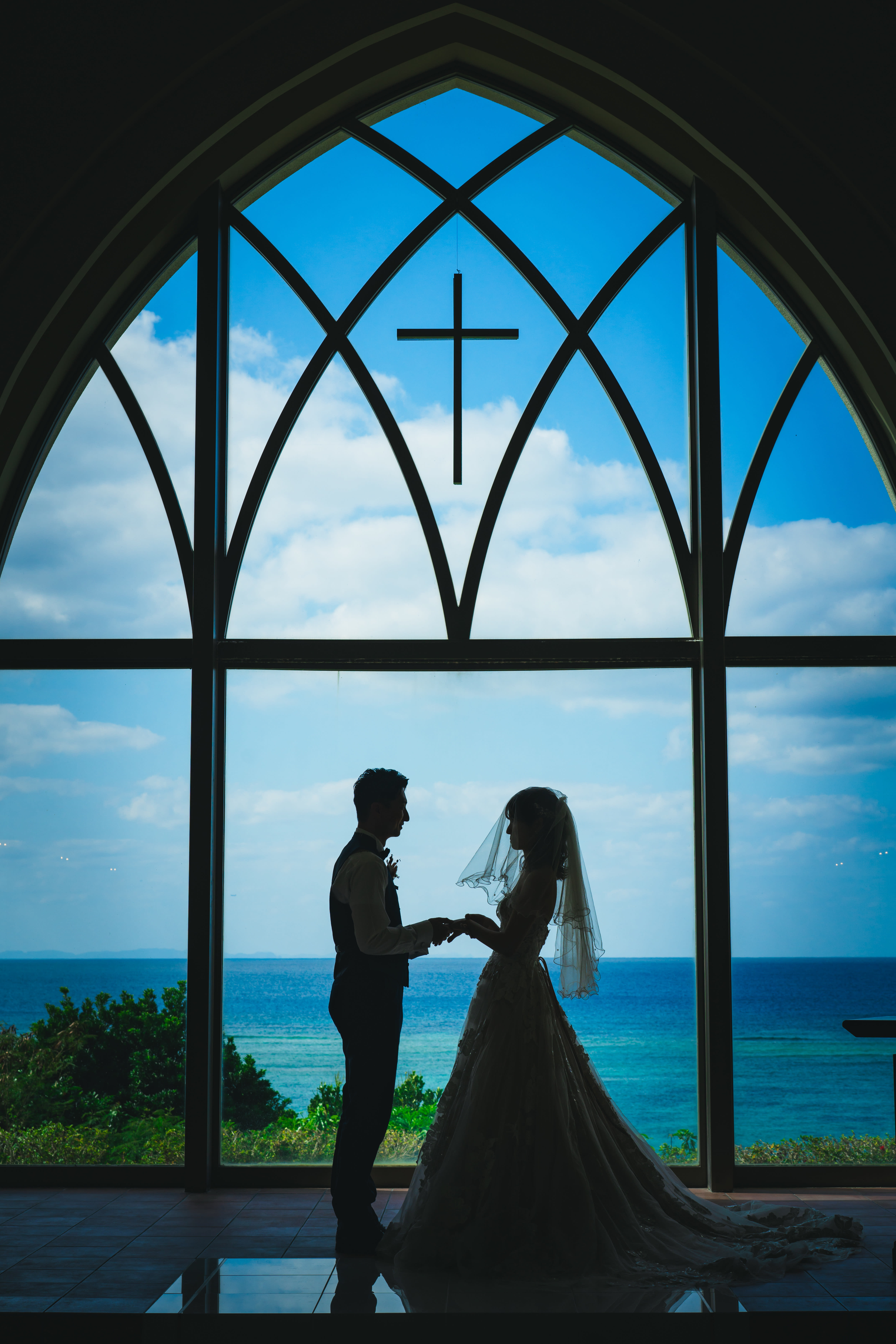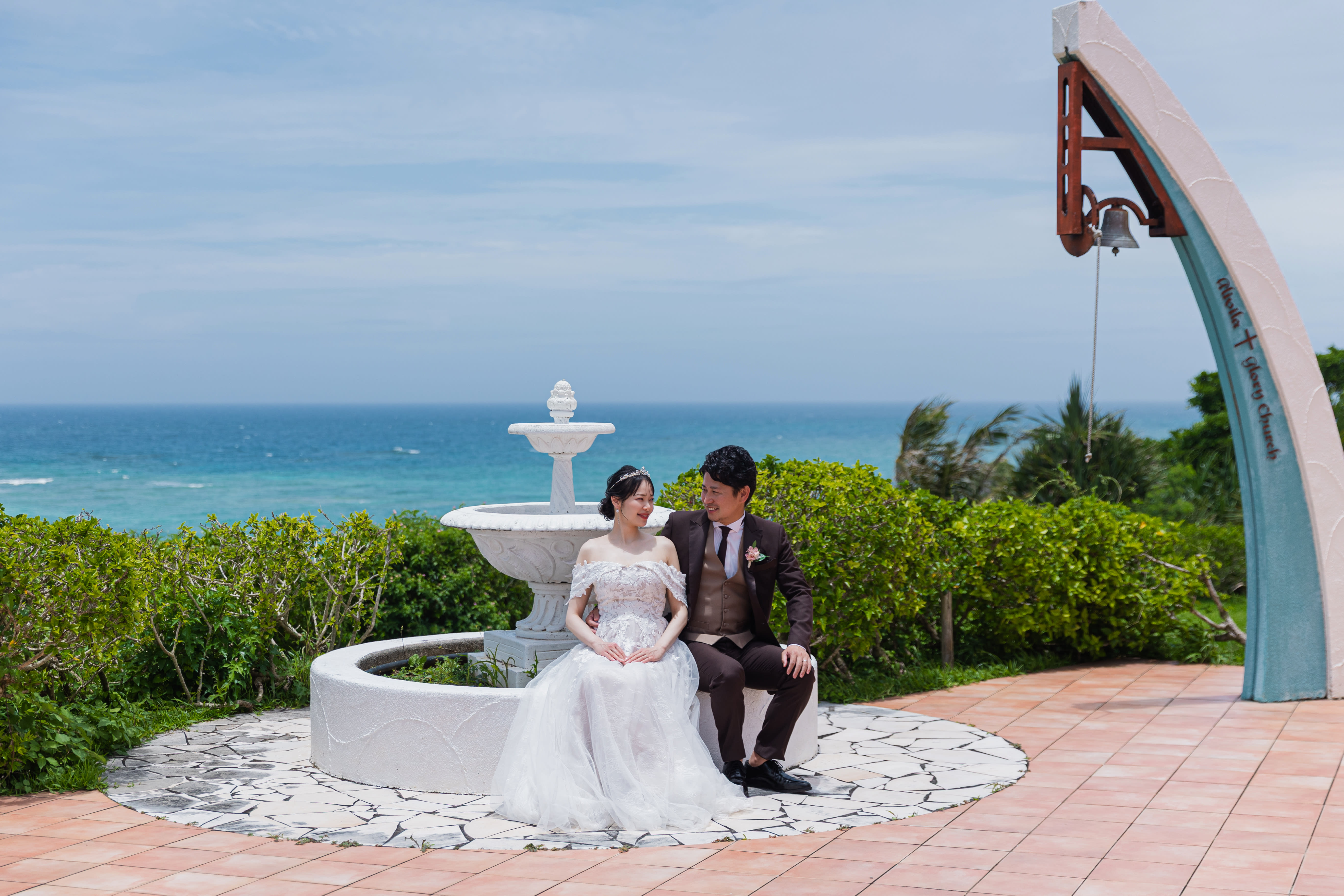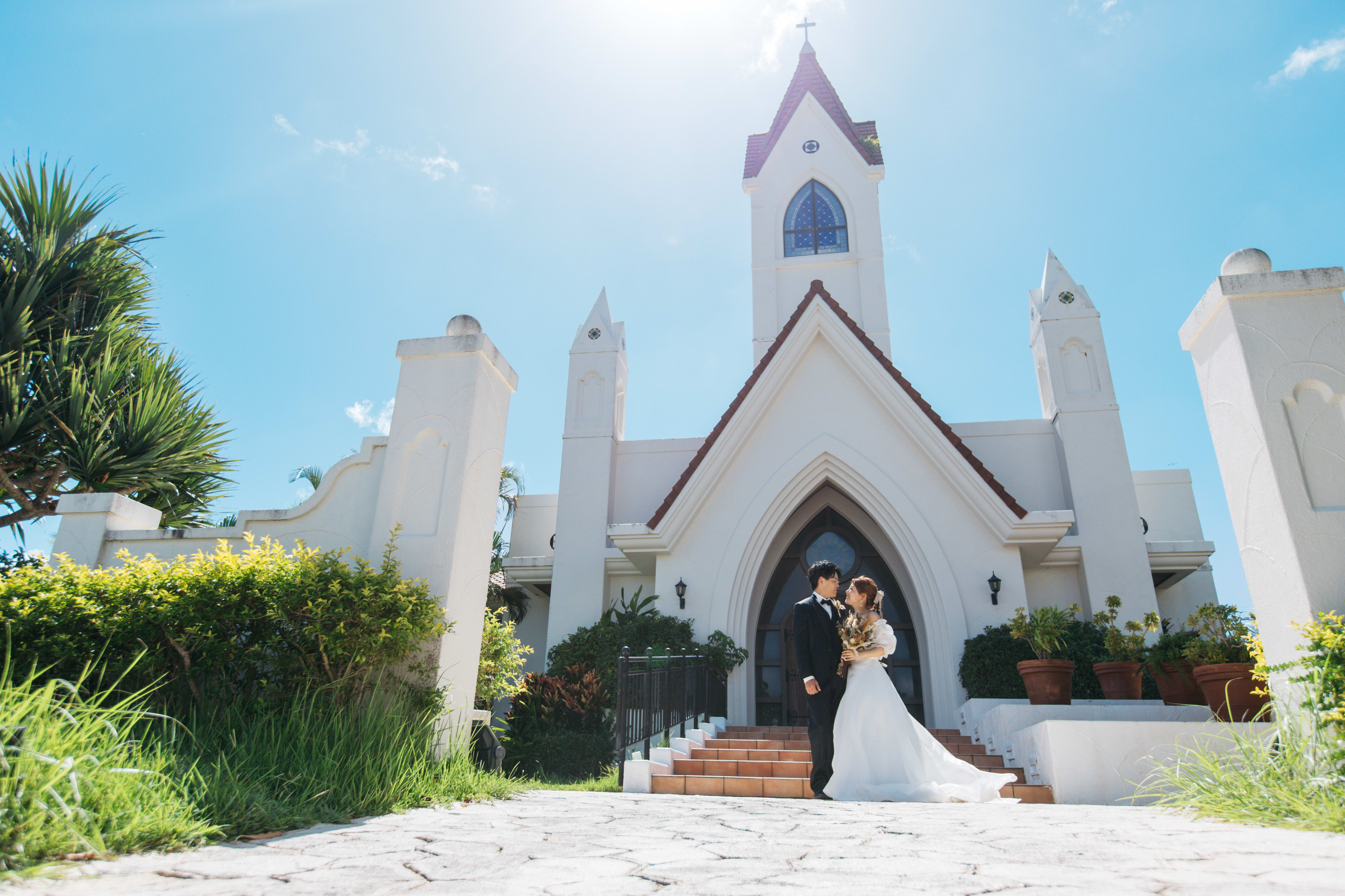 海が見えるクラシカルな教会と沖縄中部のビーチでの撮影をセットにした贅沢なプラン