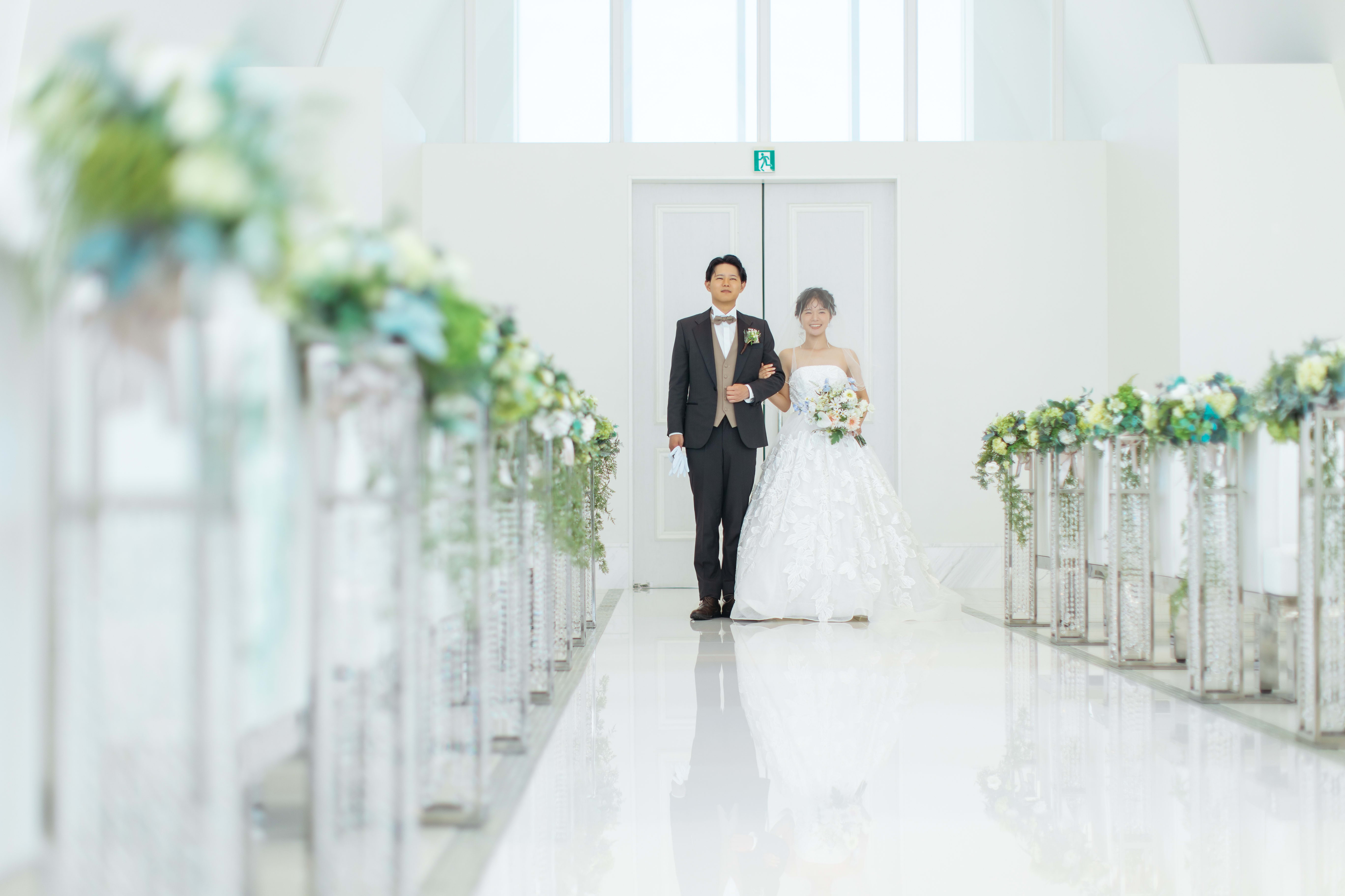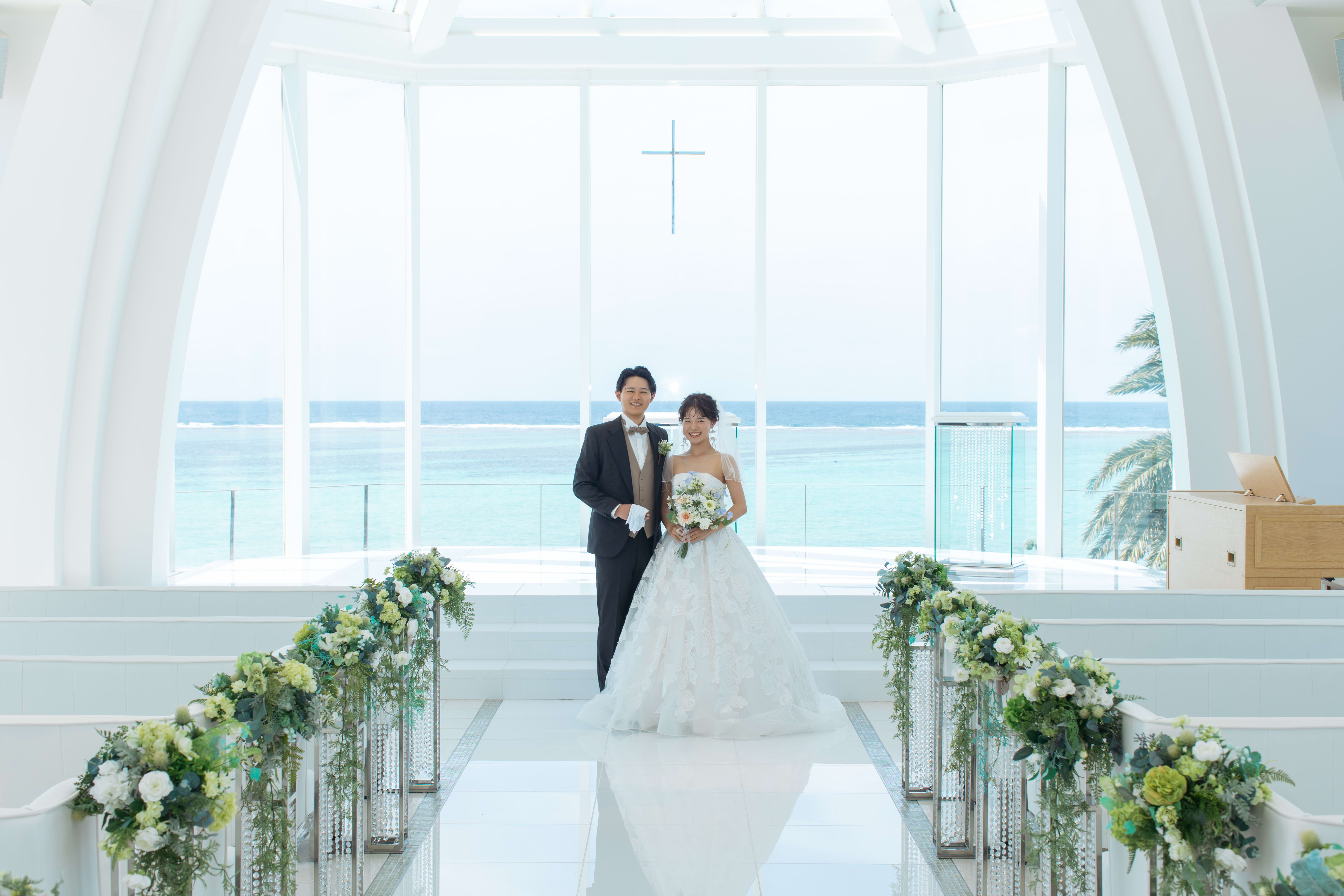 沖縄の青い空と海が広がるオーシャンビューチャペル。 白を基調にしたチャペルは、光が反射して新郎新婦をより美しく輝かせます。