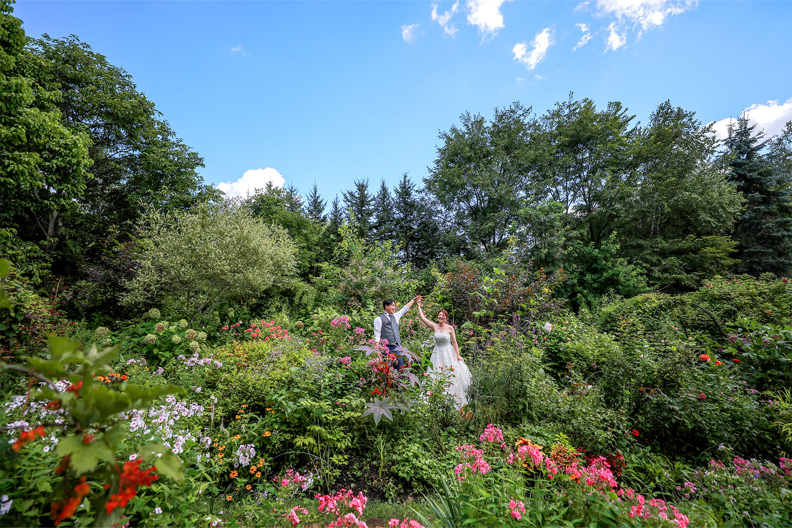 緑のグラデーションとカラフルな花をバックに、特別な1枚を残すことができます。
